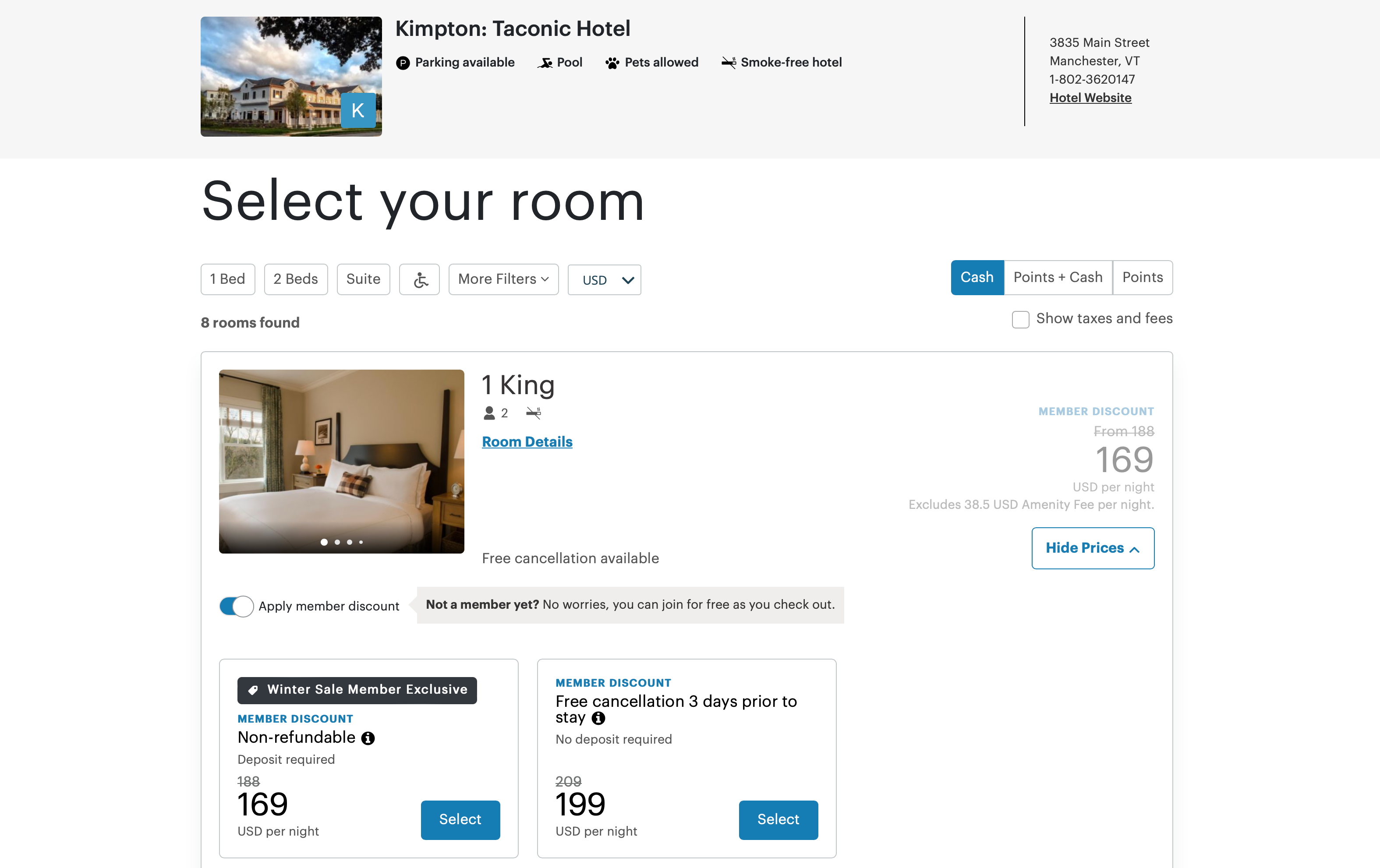 One example is the Kimpton Taconic Hotel in the Green Mountains of Manchester, Vermont. Looking at a late spring stay, we found a 10% discount from the regular member discount and 20% from the usual rate of $209 for the special winter sale.