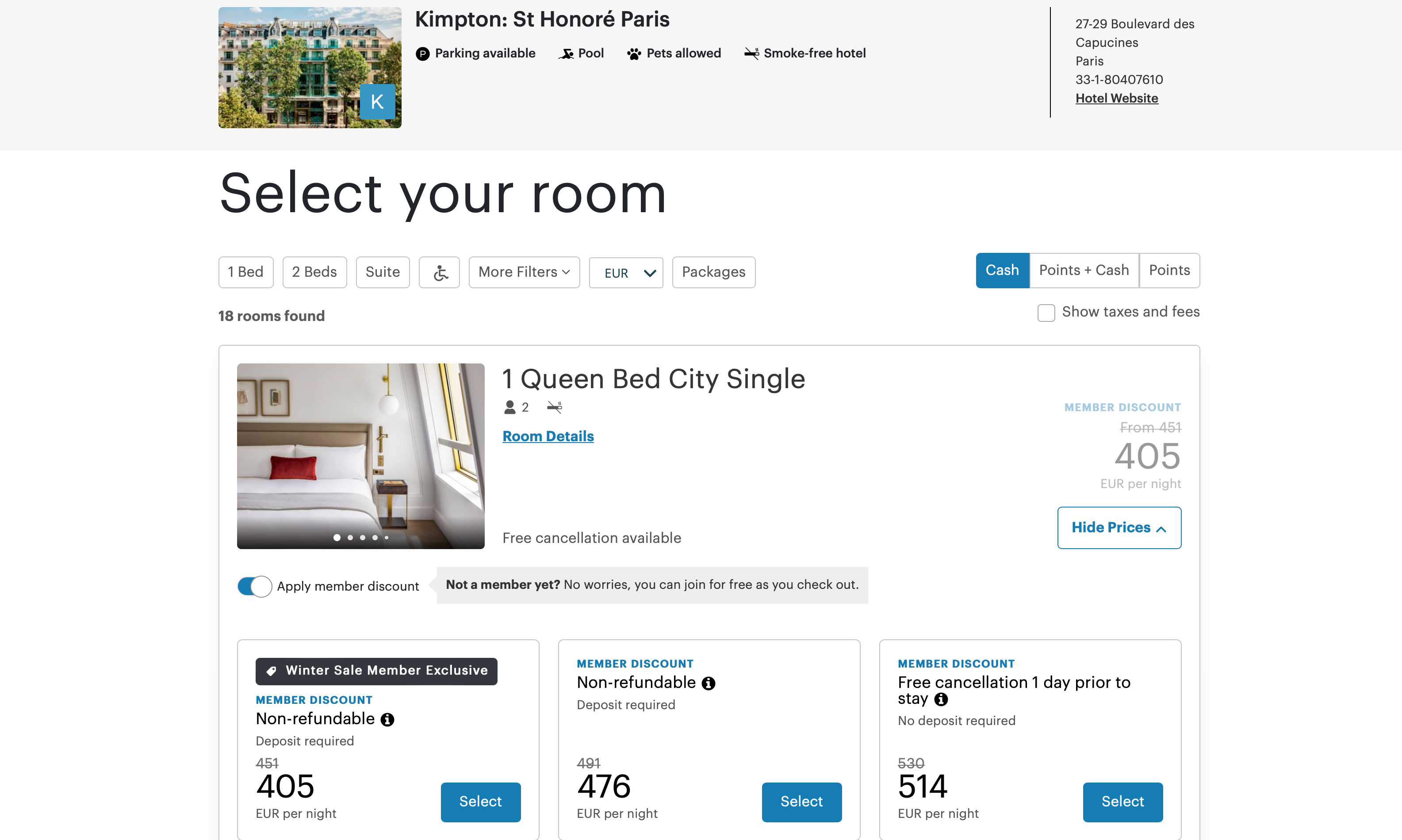 In Paris, the Kimpton St Honore also offers 20% off the regular rack rate for members.