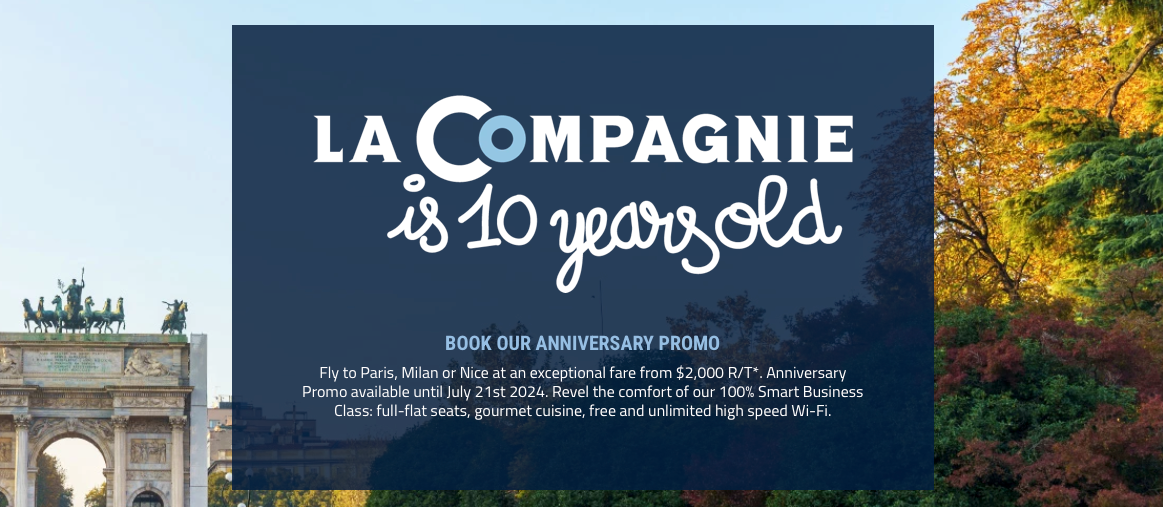 As the world's only all-business-class airline, La Compagnie operates six flights weekly from New York City to Paris and Milan, with seasonal service to Nice through the end of summer and then resuming in April 2025.