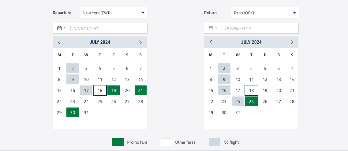 Use the carrier's calendar to book promo fares, which are indicated in green.