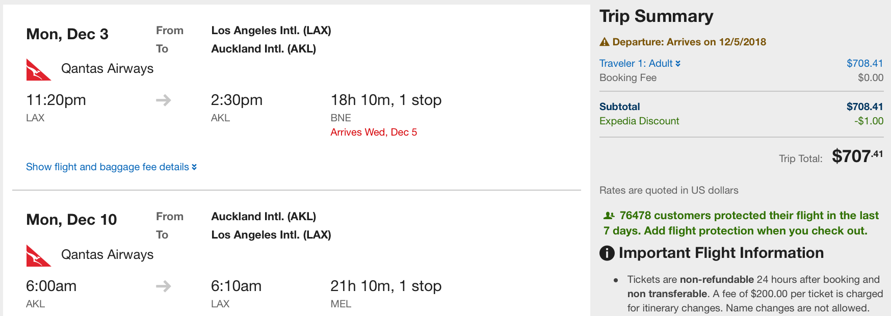 Los Angeles (LAX) to Auckland (AKL) in December for $707 round-trip on Qantas via Expedia:
