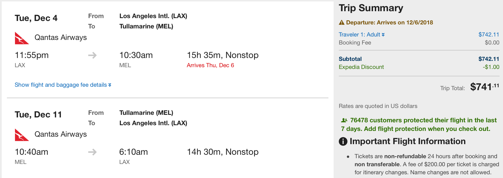 Los Angeles (LAX) to Melbourne (MEL) in December for $741 round-trip on Qantas via Expedia: