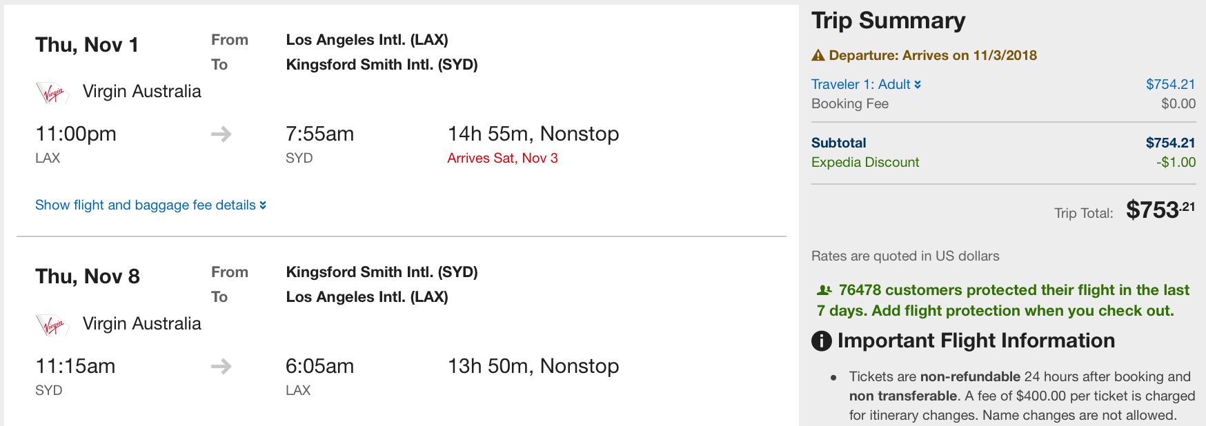 Los Angeles (LAX) to Sydney (SYD) in November for $753 round-trip on Virgin Australia via Expedia: