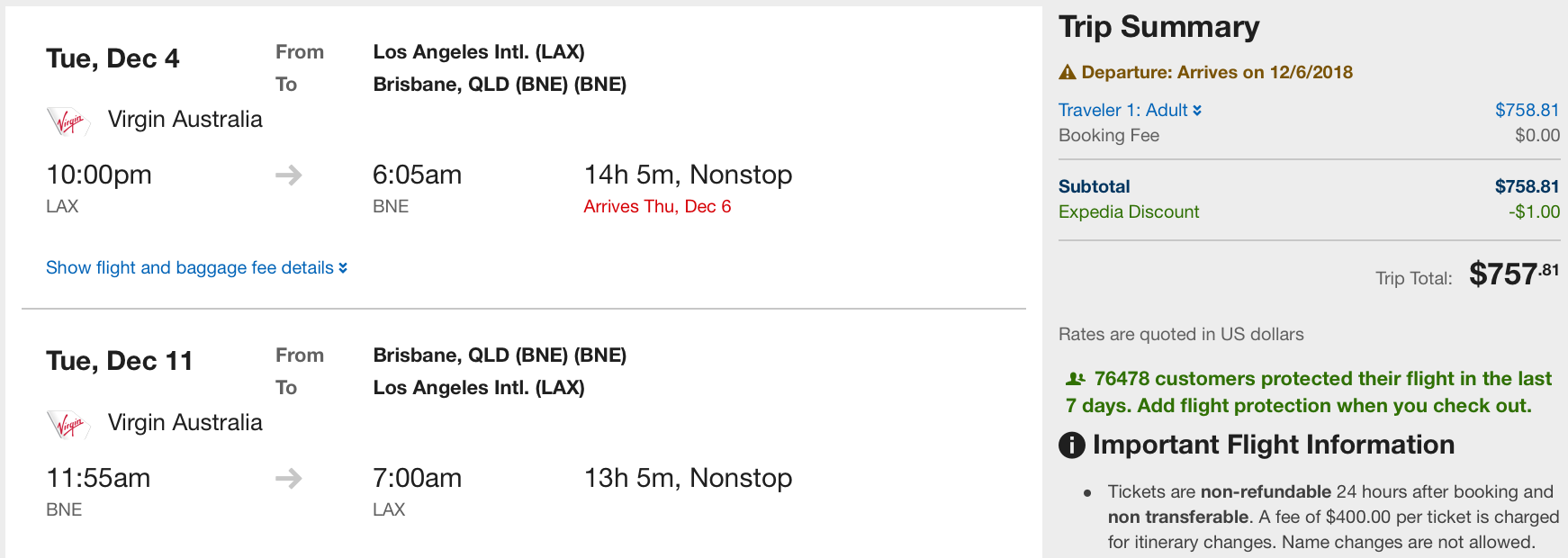 Los Angeles (LAX) to Brisbane (BNE) in December for $758 round-trip on Virgin Australia via Expedia: