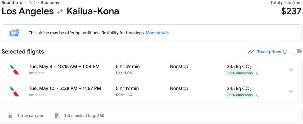 This deal is for flights to five of the Hawaiian islands from LAX. Take your pick of destination by searching your departure city and origin of choice via Google Flights, such as the below flight to Kona the first week of May on American Airlines.