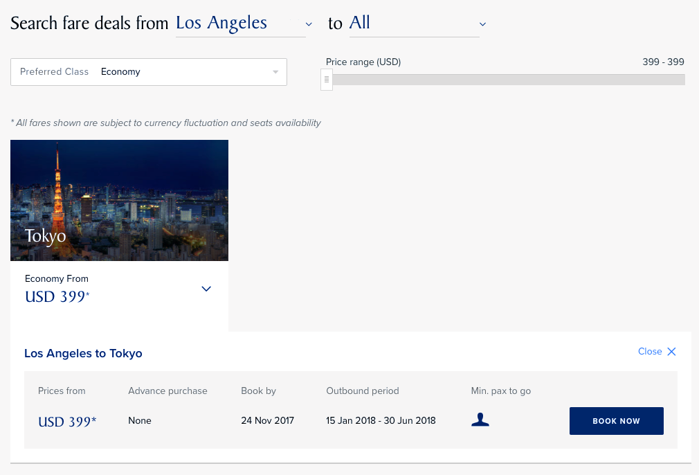 Once logged in, you'll get a screen where you can choose either "Los Angeles" or "San Francisco" in the "Search Fares deals from" box. The only deal for Los Angeles currently is to Tokyo for $399, and for San Francisco to Hong Kong for $498.