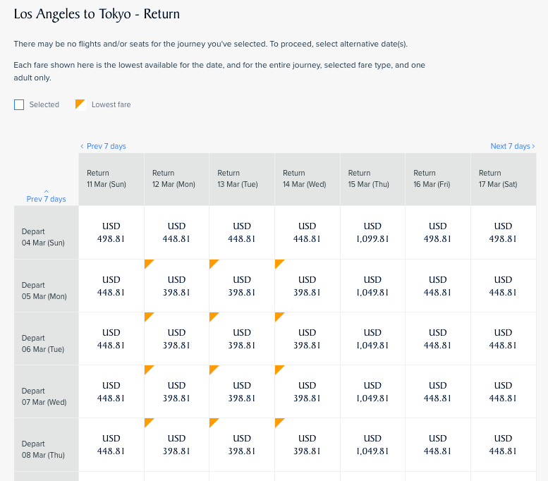 Airfare deals are typically only available on limited dates. We recommend you use Google Flights to find dates to fly, then book through an online travel agency, such as Orbitz or Expedia, which allows you to cancel flights without penalty by 11pm Eastern Time within one day of booking. However, if you're using the American Express Platinum Card, you'll need to book directly with the airline or through Amex Travel portal to get 5x MR points. Remember: Fares may disappear quickly, so book right away and take advantage of Orbitz or Expedia's courtesy cancellation if you're unable to get the time away from work or family.