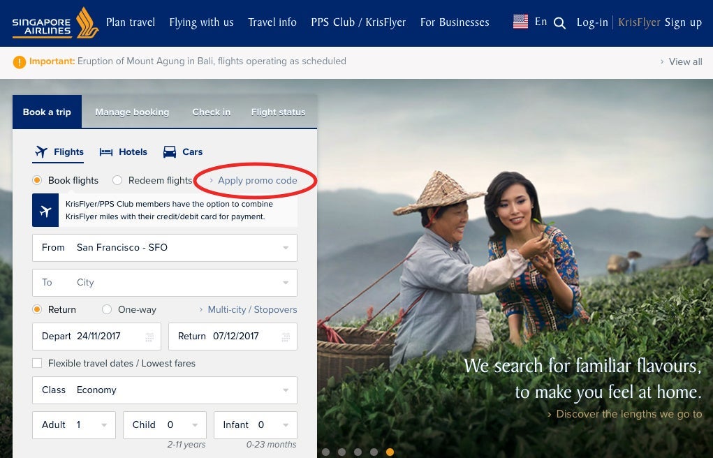 More Black Friday deals mean more cheap airfare for you. Singapore Airlines is offering a pre-Black Friday sale on flights from Los Angeles (LAX) to Tokyo (NRT) from $399 round-trip, and from San Francisco (SFO) to Hong Kong (HKG) from $498 round-trip. To book either, you'll need to follow some detailed steps. First, head to Singapore's website and enter the promo code BLACKFRIDAY.