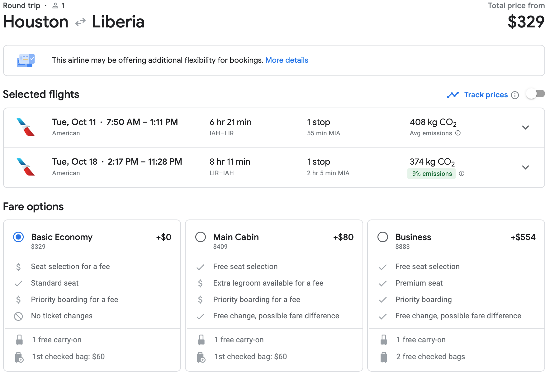 A basic cconomy ticket on American from Houston's George Bush Intercontinental Airport (IAH) to Guanacaste Airport (LIR) in October is available for only $329 round-trip, a really nice price for a fall getaway to Costa Rica.