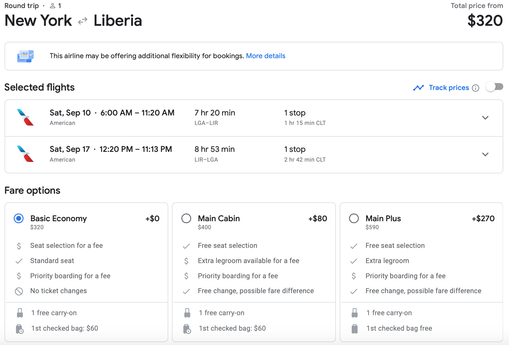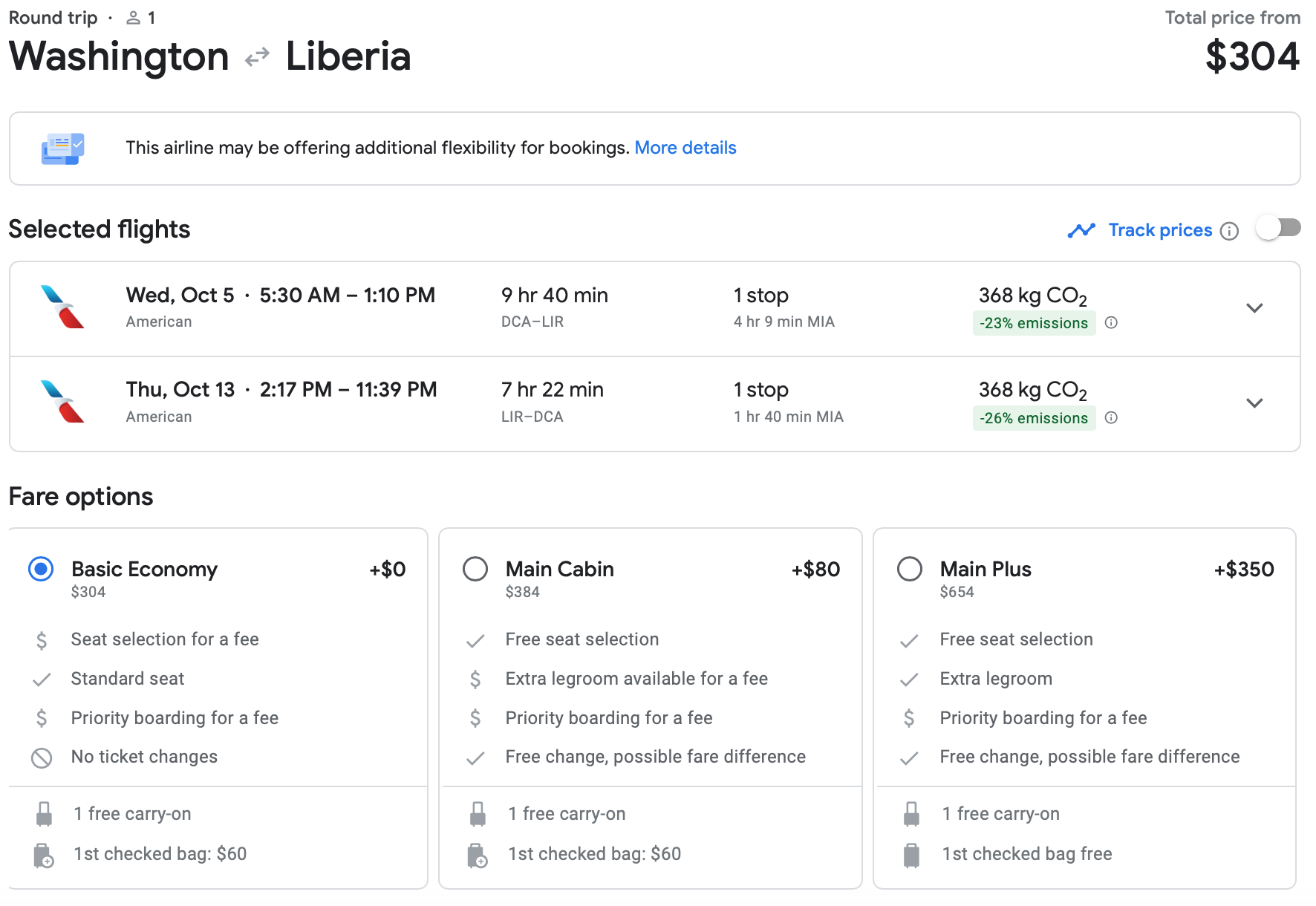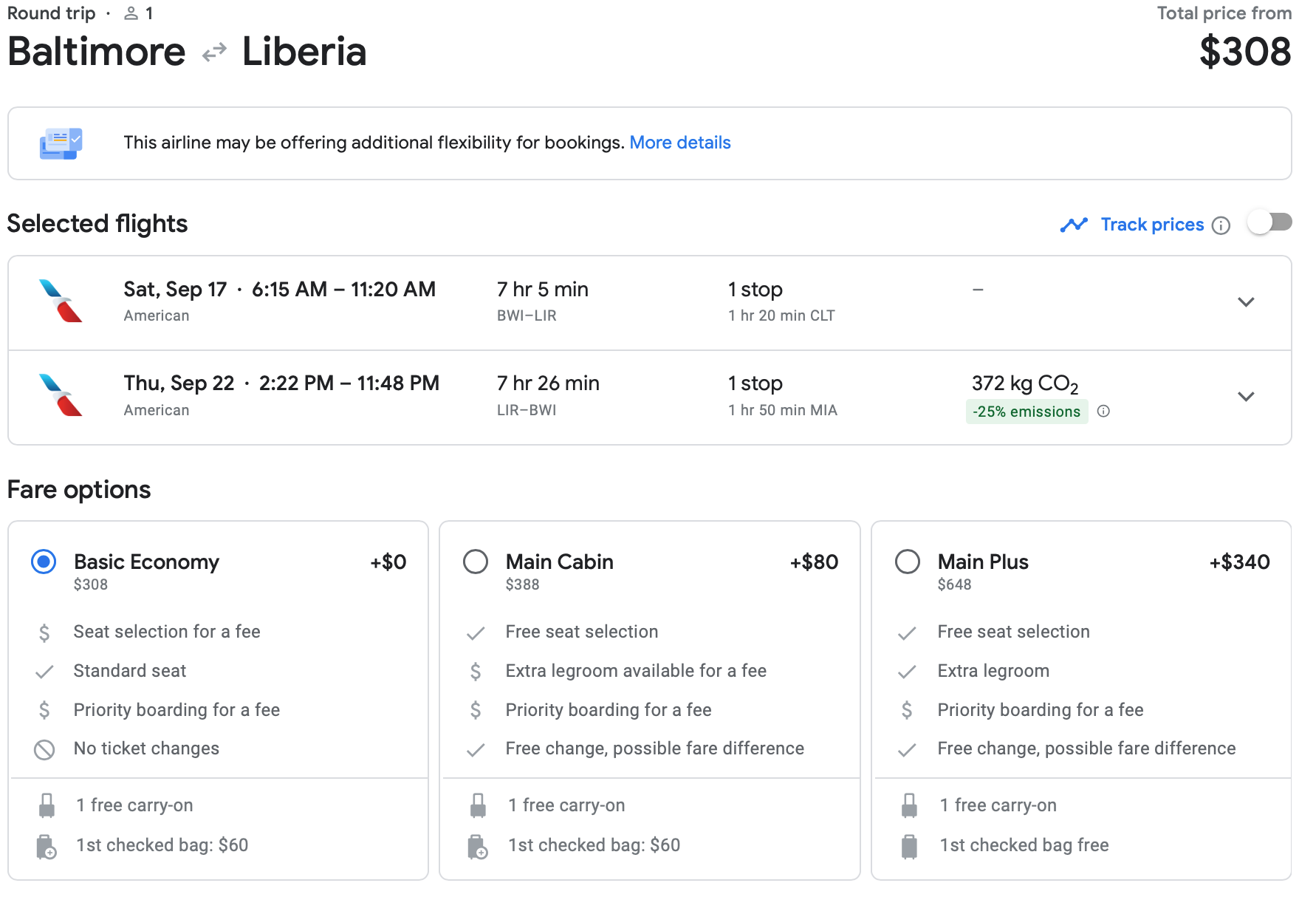 We found lots of bargain fares from Baltimore/Washington International Thurgood Marshall Airport (BWI) to Liberia. Here's one we found for just $259 round-trip on Delta for a late-October trip. Bonus: Delta's basic economy does allow for a free full-size carry-on bag.
