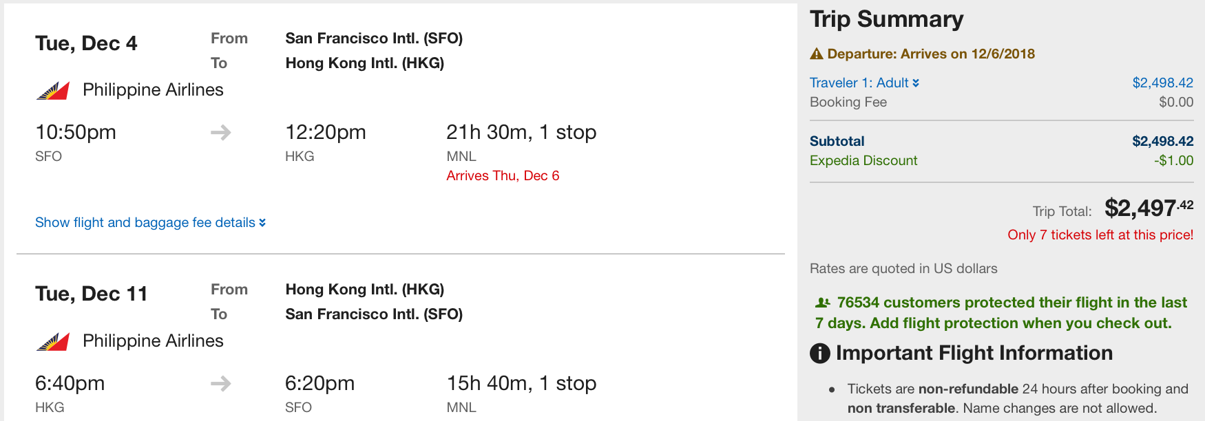 San Francisco (SFO) to Hong Kong (HKG) in December for $2,497 round-trip in business class on Philippine Airlines: