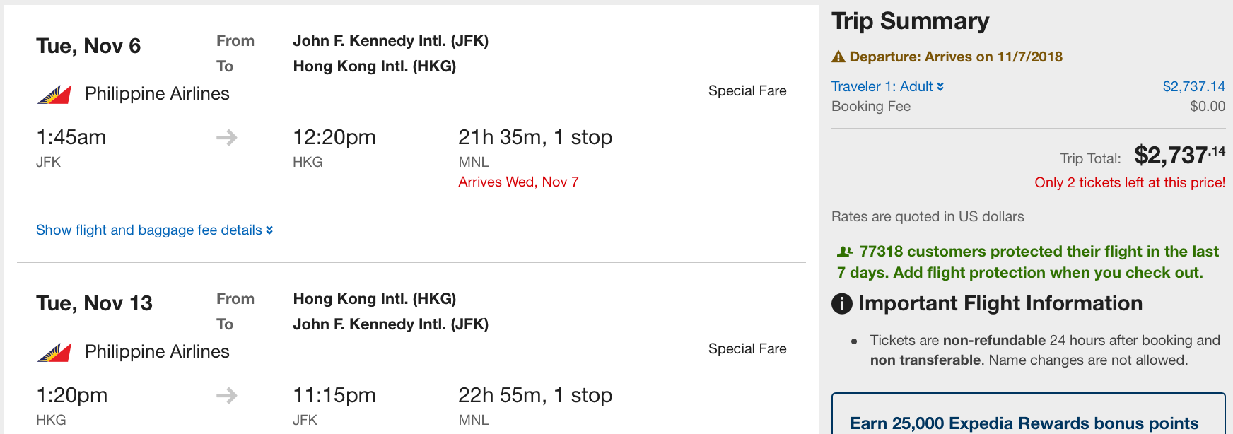 Airfare deals are typically only available on limited dates. We recommend you use Google Flights to find dates to fly, then book through an online travel agency such as Orbitz or Expedia, which allows you to cancel flights without penalty by 11pm Eastern Time within one day of booking. However, if you’re using The Platinum Card® from American Express, you’ll need to book directly with the airline or through the Amex Travel portal to get 5x MR points. Remember: Fares may disappear quickly, so book right away and take advantage of Orbitz or Expedia’s courtesy cancellation if you’re unable to get the time away from work or family.