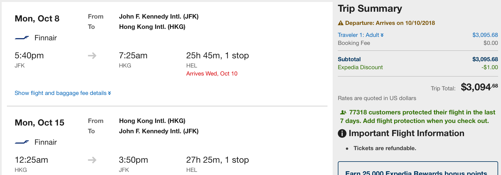 New York (JFK) to Hong Kong (HKG) in October for $3,095 round-trip in business class on Finnair: