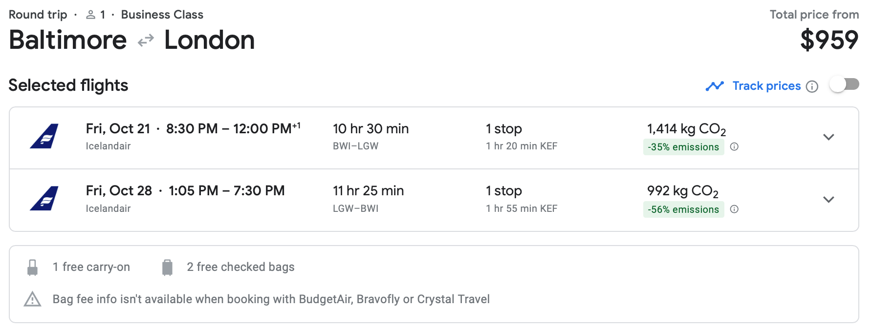 Icelandair has a number of business-class tickets from Baltimore to Gatwick in the fall on sale. All of these discounted tickets involve a layover, including some lengthy stops. However, we found this gem in late October, for $959 round trip. That's a ridiculously cheap price.