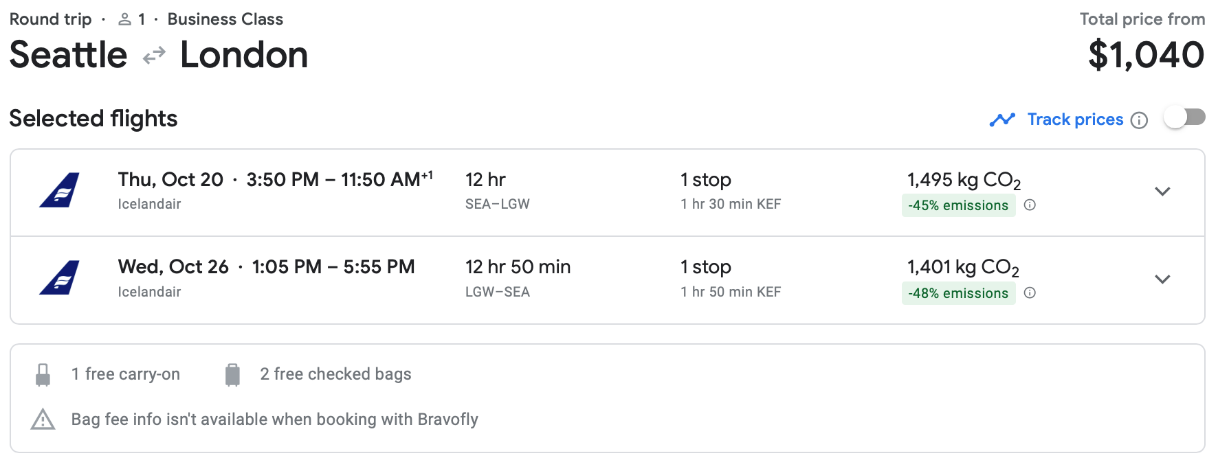 Here's another eye-popping fare we found -- Icelandair business class from Seattle to Gatwick for only $1,040 round trip. That's massive savings — so understandably, there isn't much availability at this price.