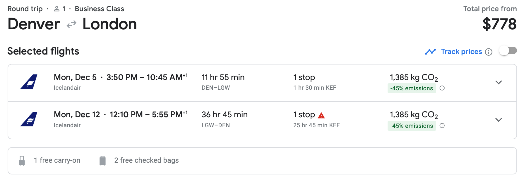 Another great Icelandair deal is available out of Denver. You can fly business class from Denver International Airport (DEN) to Gatwick in early December for just $778 round trip.