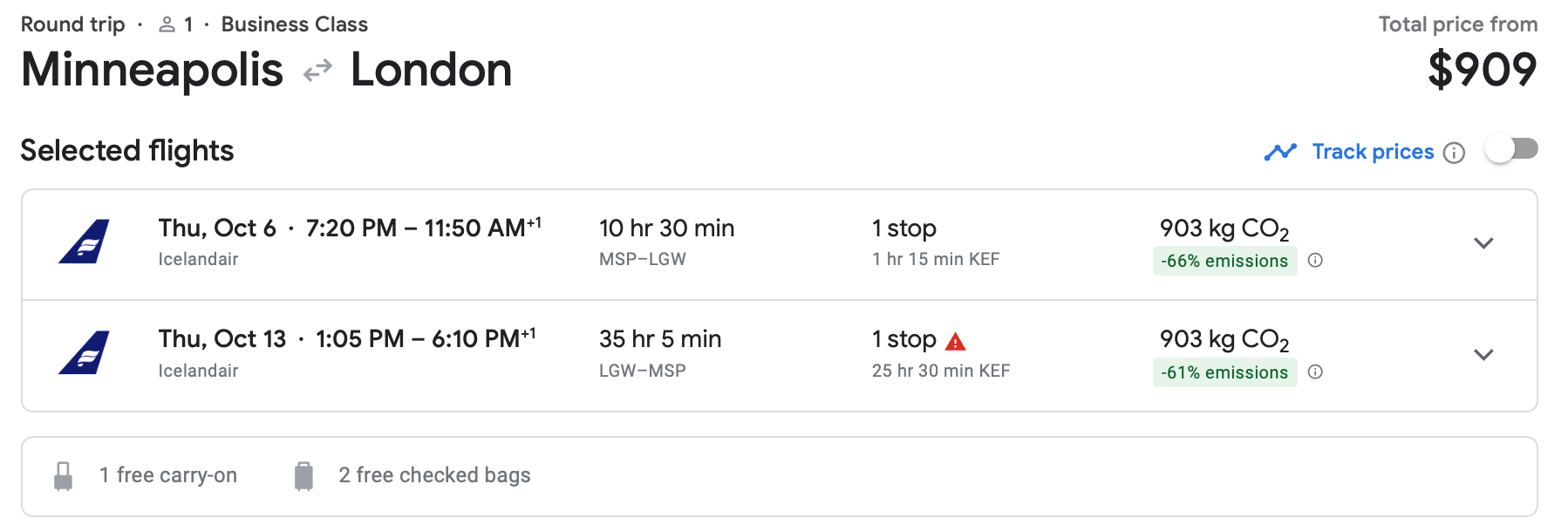 The same deal is out of Minnesota. Icelandair, the clear MVP of this fare sale, has round-trip tickets at the front of the plane out of Minneapolis-St. Paul International Airport (MSP) for the low, low price of $909.