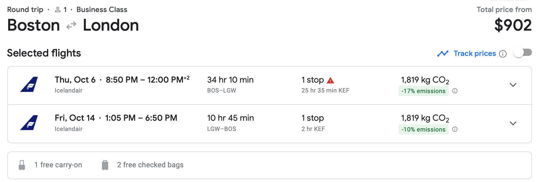 Here's one more. Boston to Gatwick in October is available for $902 round trip. There's a day-long layover involved here too, but this time it's on the departure flight.
