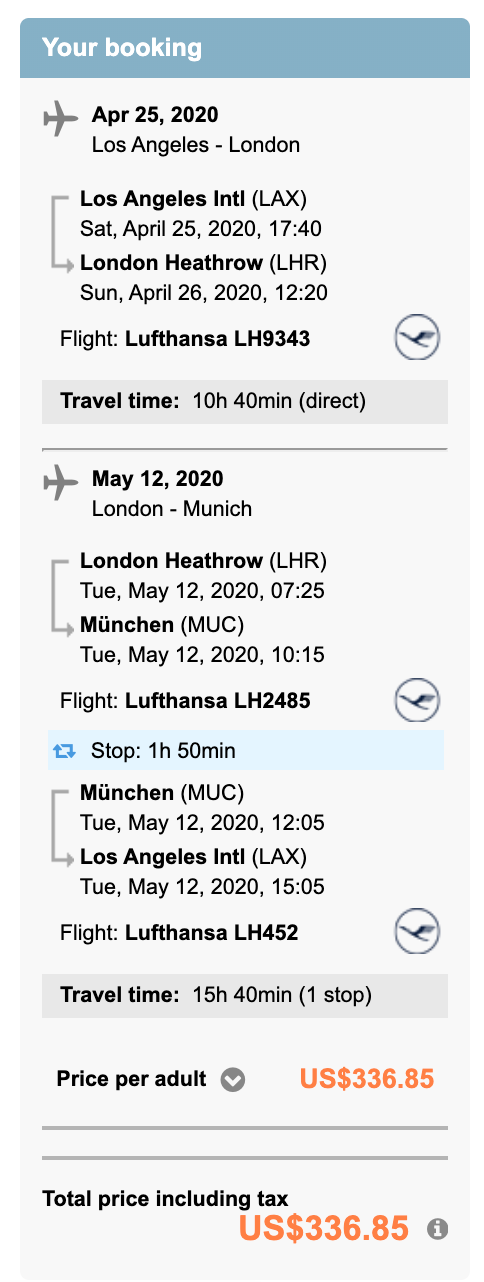 Los Angeles (LAX) to London Heathrow (LHR) for $337 round-trip on Lufthansa via Gotogate: