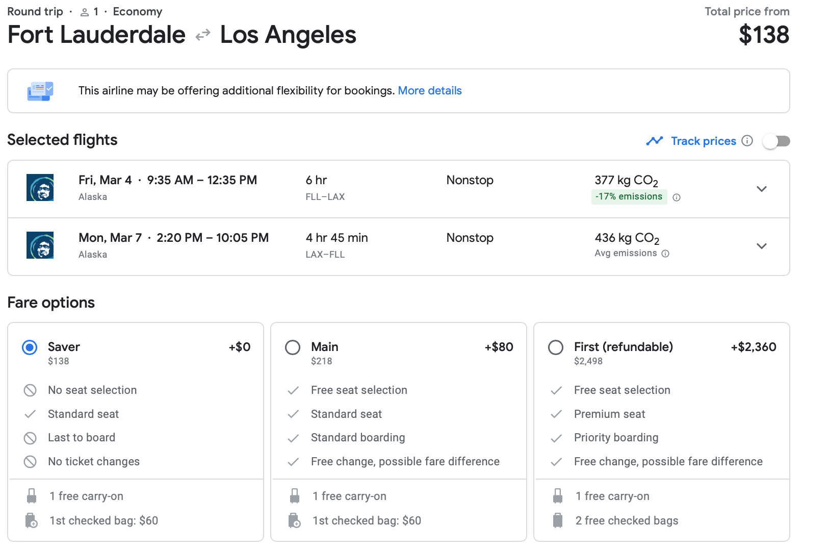 Alaska Airlines has nonstop Saver fares in March from Fort Lauderdale (FLL) to Los Angeles for $138.