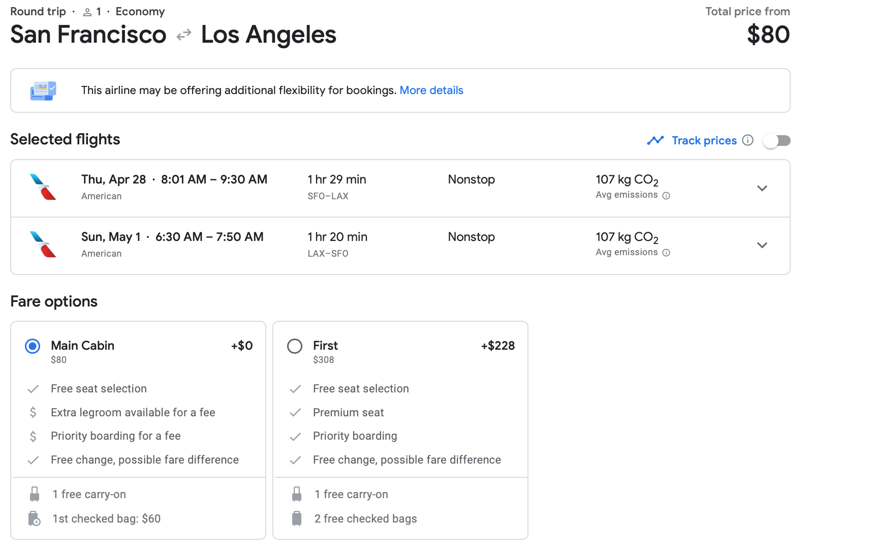 American Main Cabin fares from San Francisco (SFO) to LAX in late April can be booked for just $80. That's a huge discount from what that itinerary usually costs at that time of year. We also found lots of availability at the same bargain price for the same route in March.