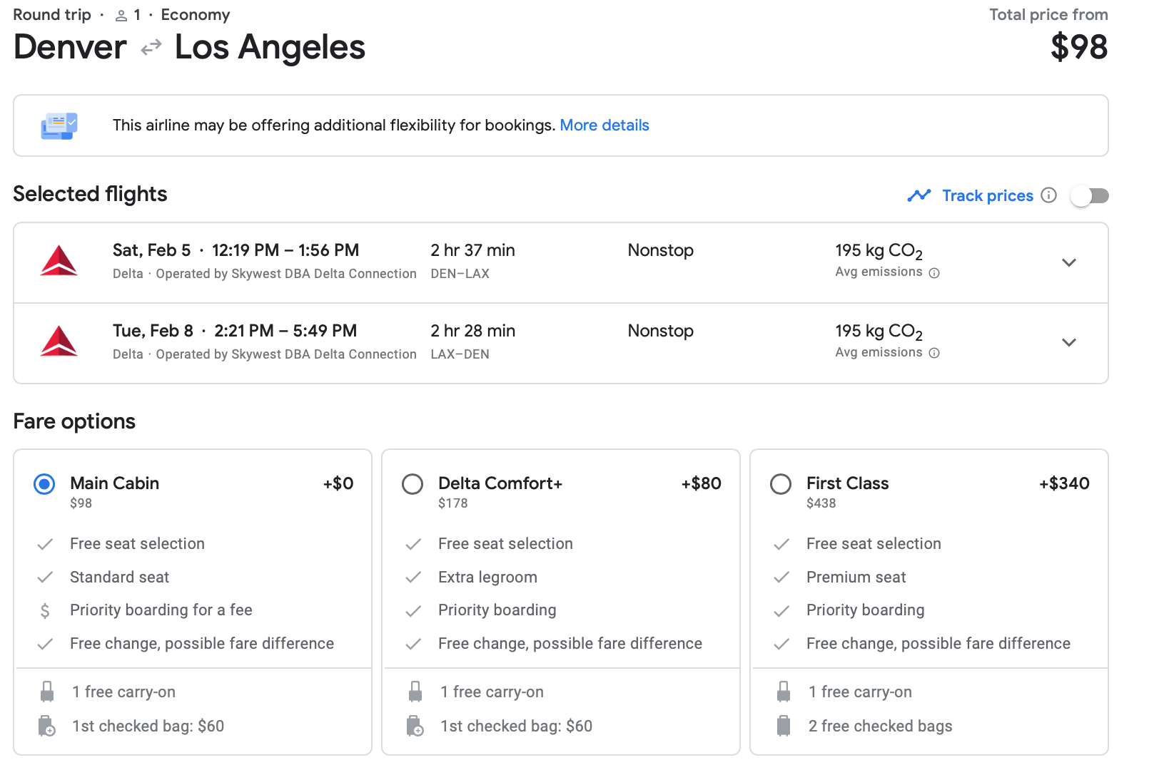 Delta Main Cabin fares from Denver (DEN) to LA can be had for under $100 round-trip in February.