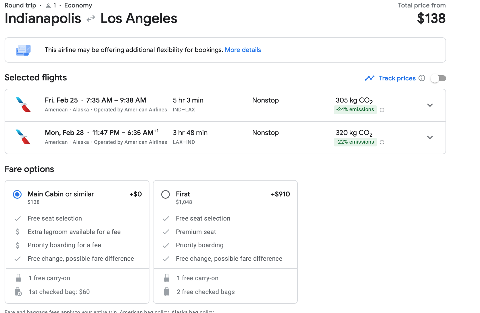 Here's another great fare we found in this deal — Indianapolis (IND) to Los Angeles for just $138 nonstop in late February is almost too good to pass up. That ticket usually will cost close to $400. And it's on American, so it's a Main Cabin fare, which comes with the carry-on bag. So if you're a savvy traveler who knows how to maximize space in your carry-on, then you want to jump on this long weekend itinerary.