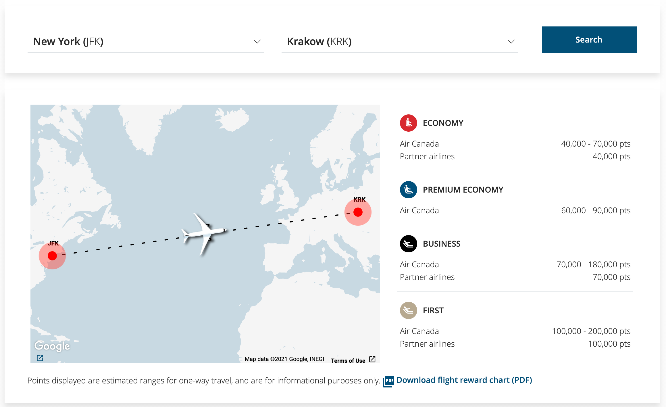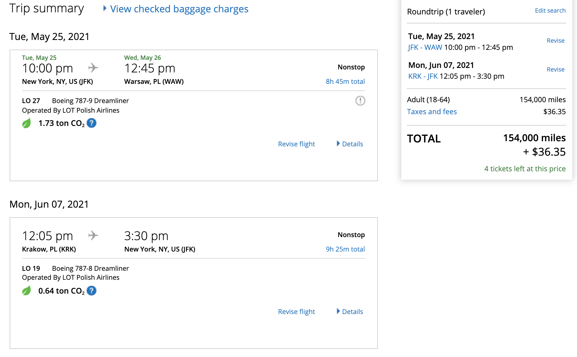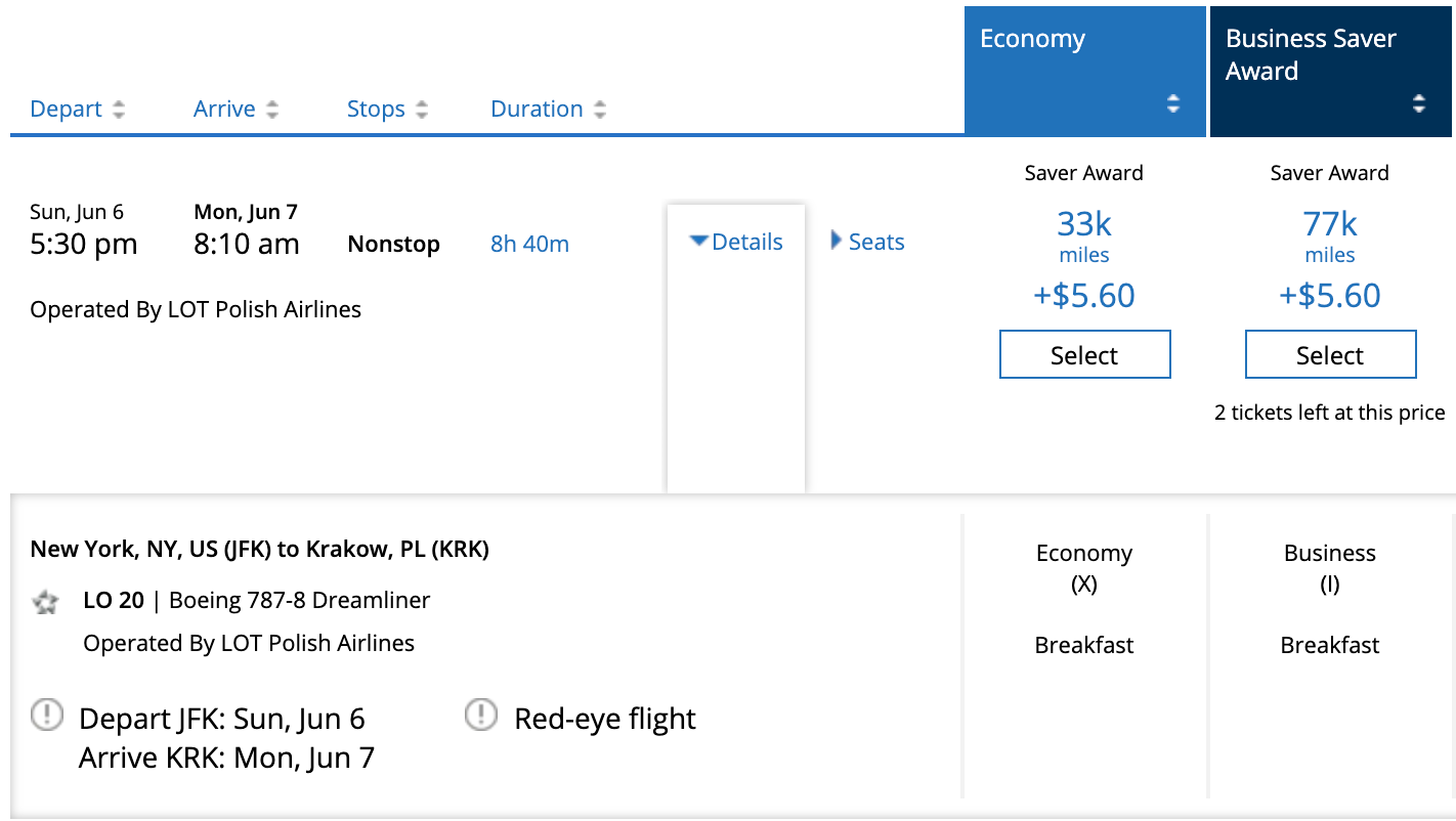 If you're flying economy, meanwhile, you might even want to book with cash. The airline is charging just $273 for a one-way flight between JFK and Krakow at the moment, or $498 for a round-trip. Business-class flyers will be better off redeeming miles, though — currently, both one-way flights and round-trip bookings cost about $3,400, a hefty price to pay for a lie-flat on LOT.