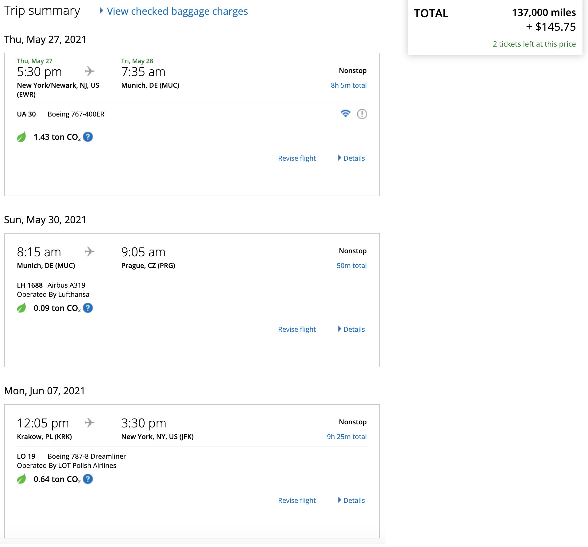 Or, you can piece together a multi-country Europe trip using United's "Excursionist Perk." For example — you can fly United business class from Newark (EWR) to Munich (MUC), spend a few days in Munich then fly Lufthansa on to Prague (PRG) and drive through the Czech Republic and perhaps Slovakia en-route to Krakow for your LOT flight home.