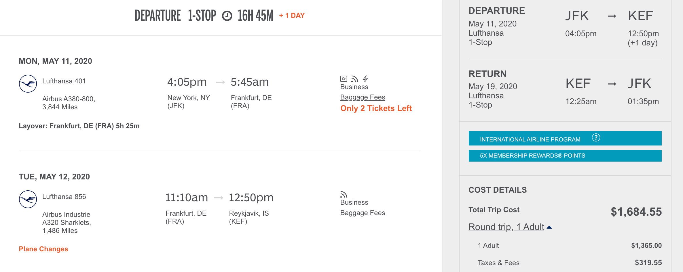 The best deals can be found using Amex Travel's International Airline Program (IAP), which is a perk you have if you hold The Platinum Card® from American Express, The Business Platinum Card® from American Express, or The Centurion Card from American Express. Make sure you check there first, which drops the price to Reykjavik to $1,685. The deals are also bookable via Google Flights, but expect pay about $200 more. The deals appear to be available in April 2020 and note that some of the return legs may be on Star Alliance partners like Swiss.