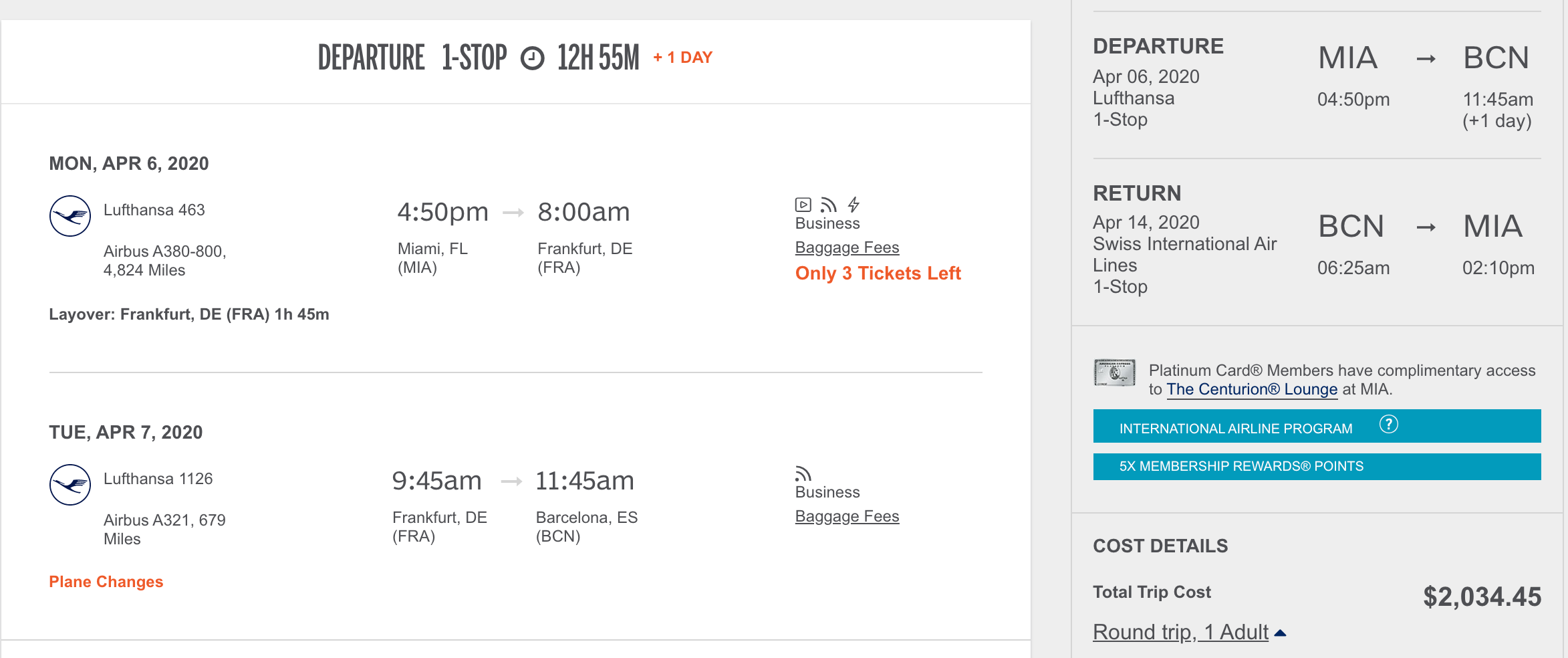 Miami (MIA) to Barcelona (BCN) for $2,034 round-trip in business: