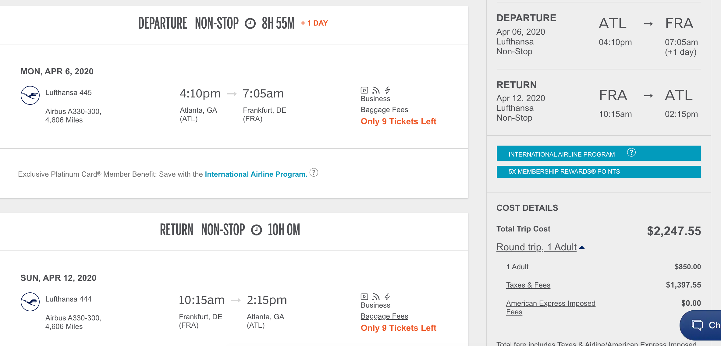 Atlanta (ATL) to Frankfurt (FRA) for $2,248 round-trip nonstop in business: