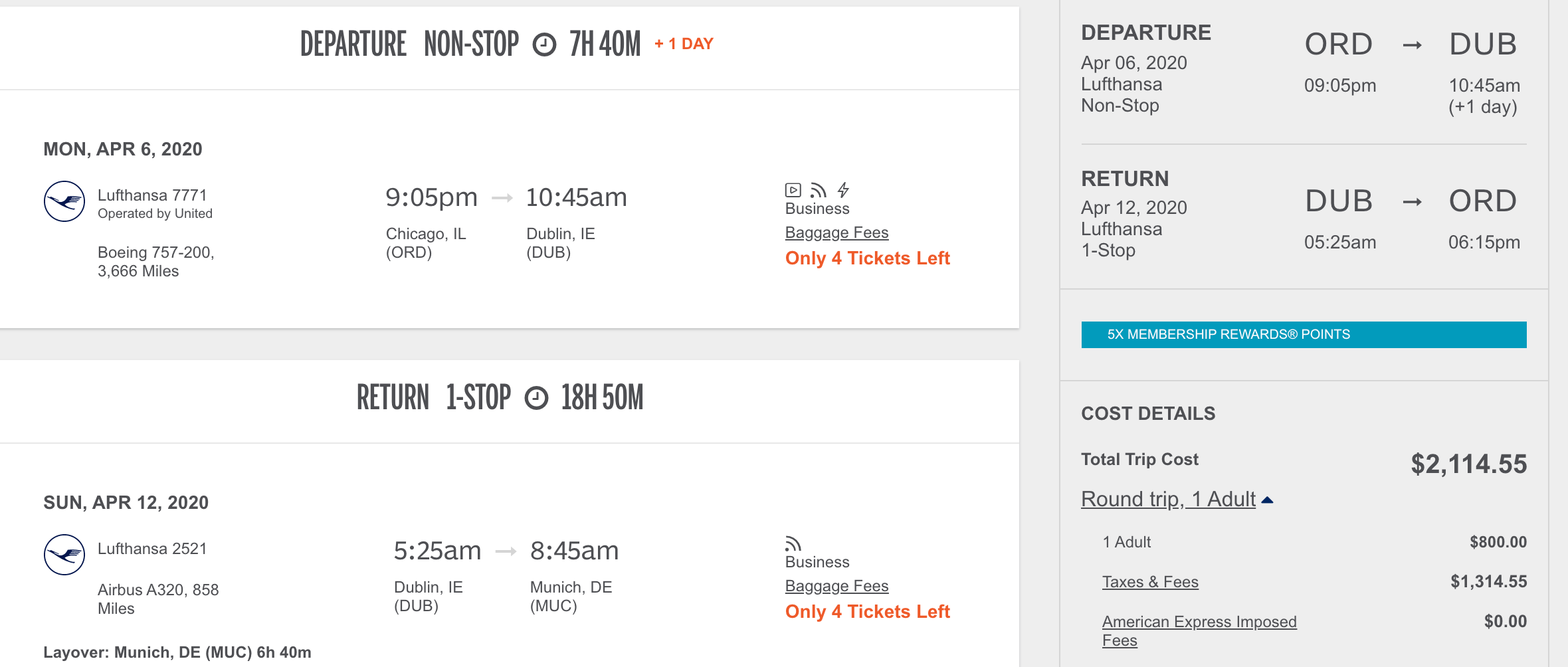 Chicago (ORD) to Dublin (DUB) for $2,115 round-trip in business: