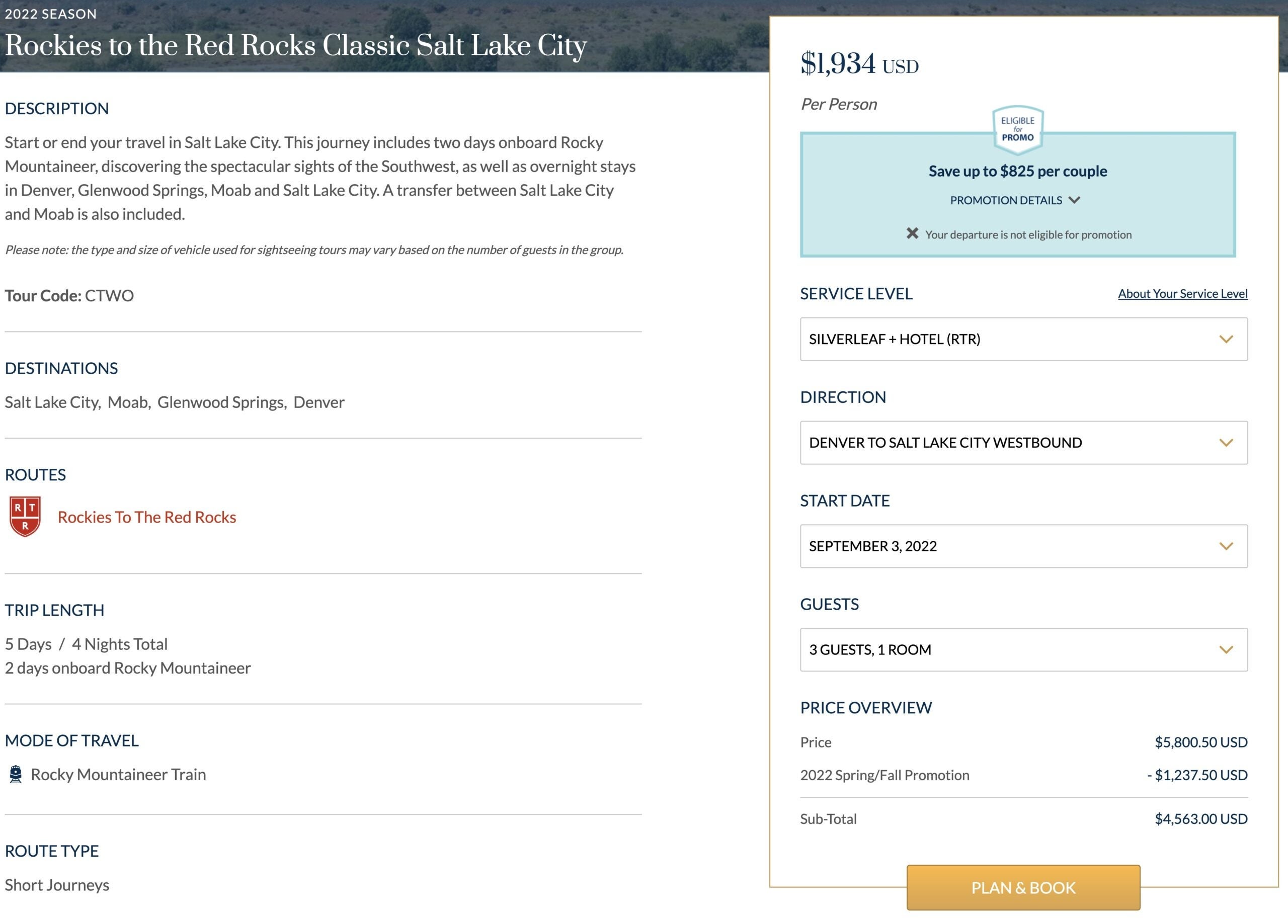 And if you wanted to bring a child or travel as a group of three friends, you could book the Rockies to the Red Rocks Classic Salt Lake City tour over Labor Day Weekend in September for $1,521 per person or $4,563 total for three people.