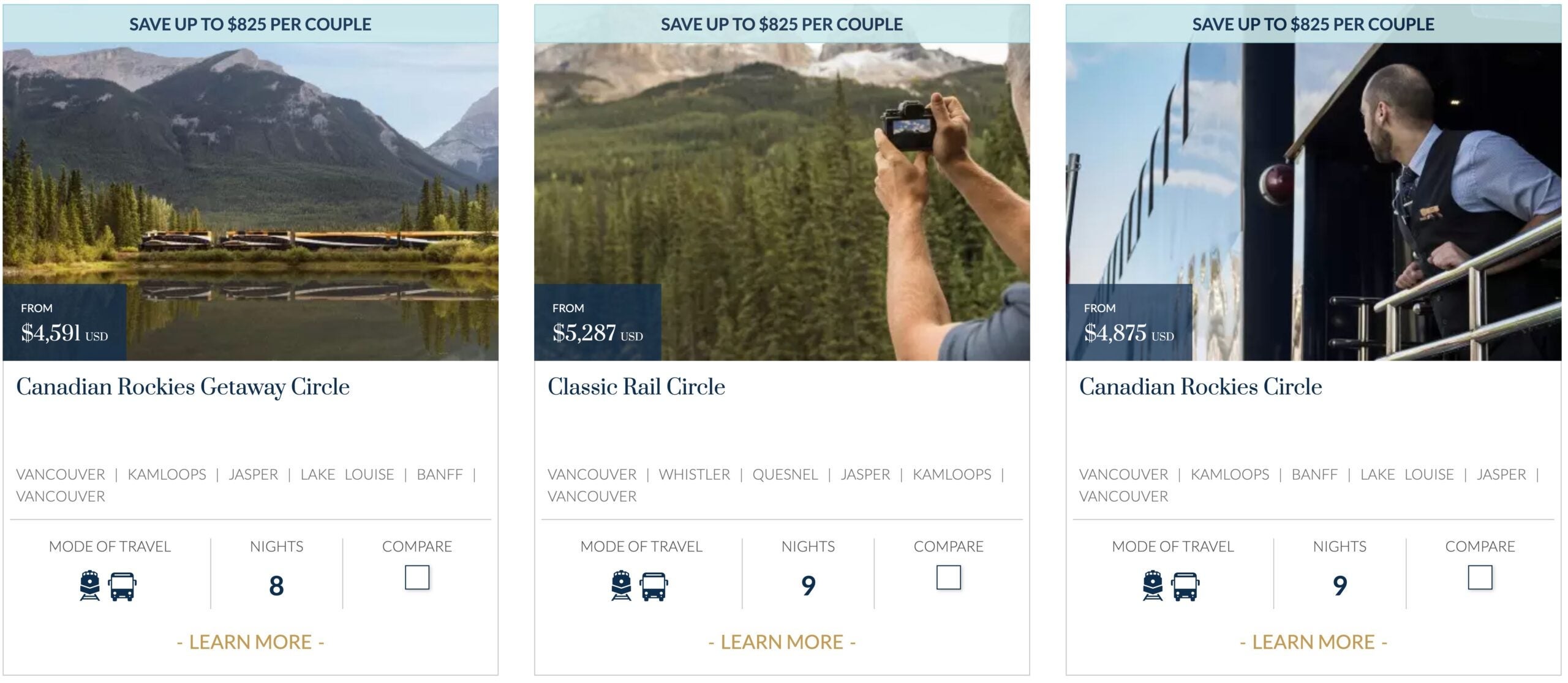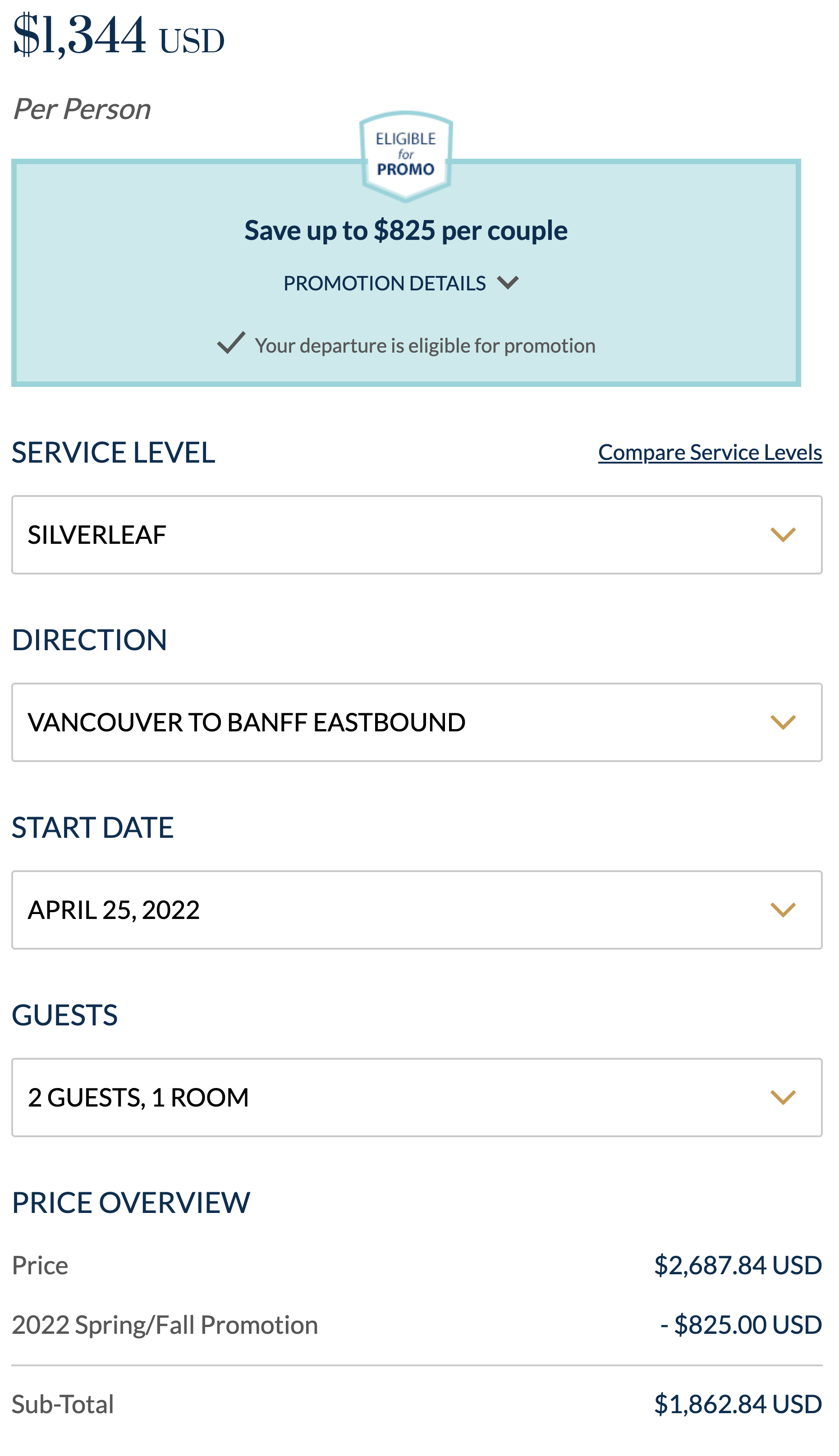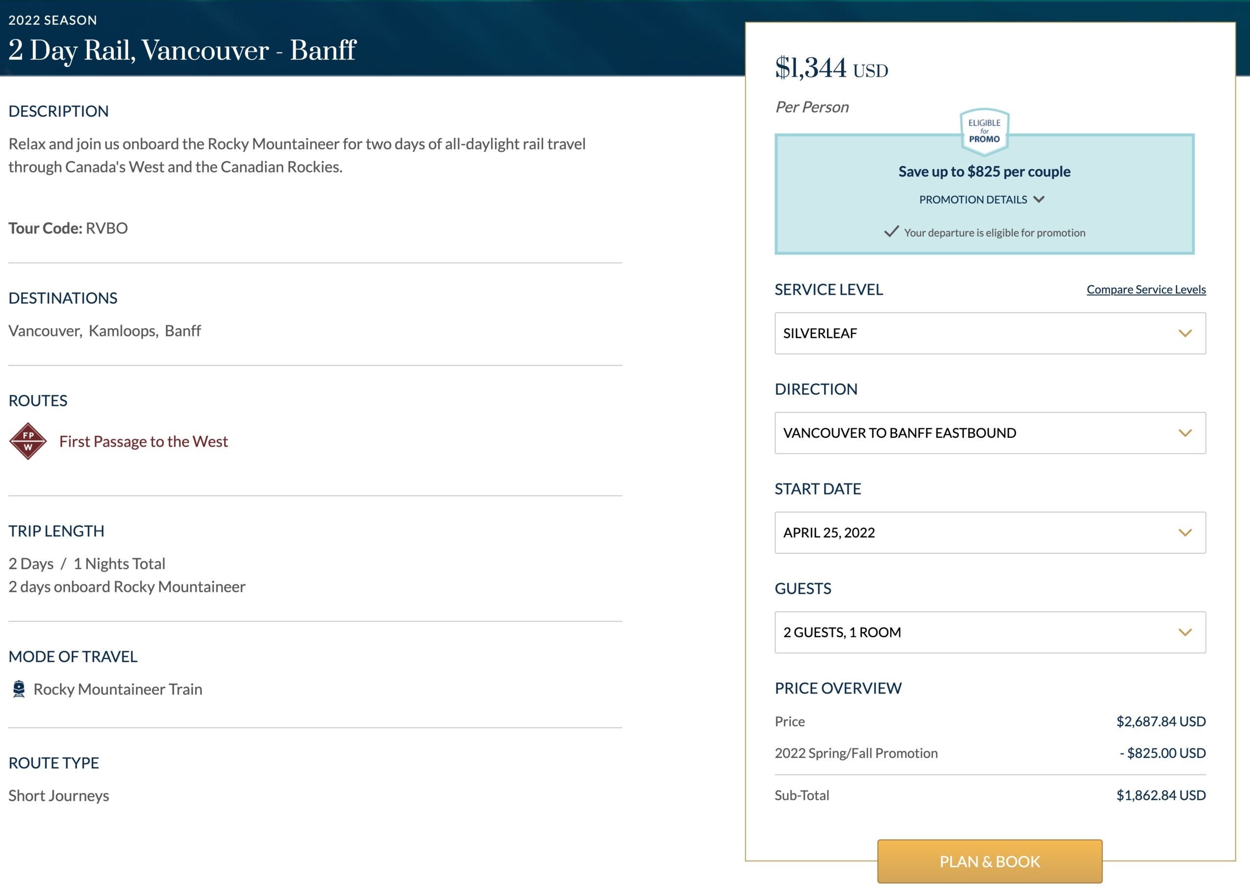 Rail journeys between Vancouver and Banff start from $1,344 per person at the SilverLeaf level, which means a couple can book this two-day, one-night package for a total of $1,863 on a few dates in April and October during this promotion. Prices will vary by month.
