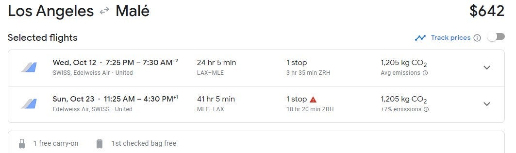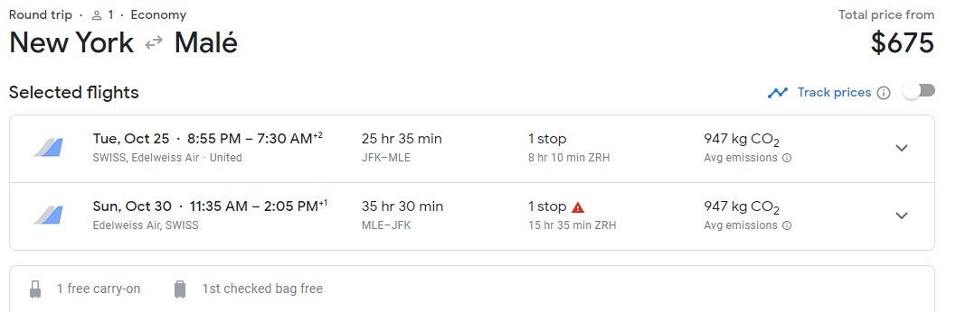 This sample flight on Swiss Airlines from New York's JFK to the Maldives in October is priced at a very low $675. Flights on this route on other dates typically run in the $1,100 range, with some fares in December topping $2,000. The flight involves a single stopover in Zurich. Plus, the fare includes a free carry-on bag and checked bag, so no worries about hidden luggage charges here.