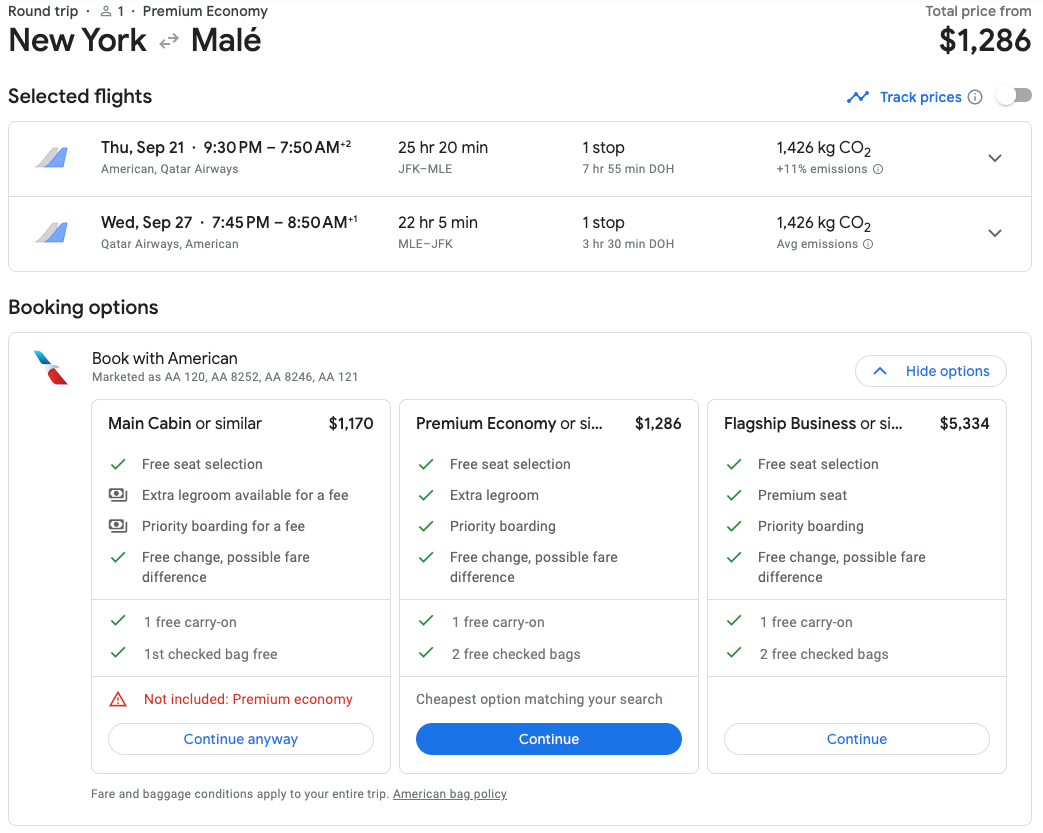 For example, you can book a round-trip flight from JFK to MLE in late September for $1,286, flying American Airlines' premium economy. This cabin includes three pieces of luggage (one carry-on item and two checked bags), extra legroom, free seat selection and a priority boarding group, among other perks. This route includes a layover of eight hours on the way to Male and 3 1/2 hours on the return.