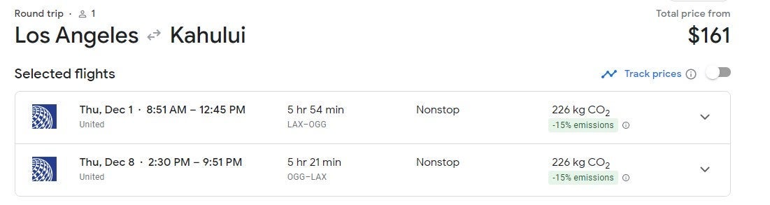 A sample Los Angeles flight on United during the same early December time period costs an identical $161 for a round-trip ticket.