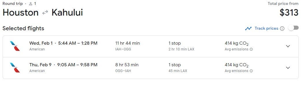 The cheapest sample flight from Houston to Maui is just $313, more than half off the typical fares on this route. This February date has one of the better overall travel times, but a number of choices are available beginning in late November.