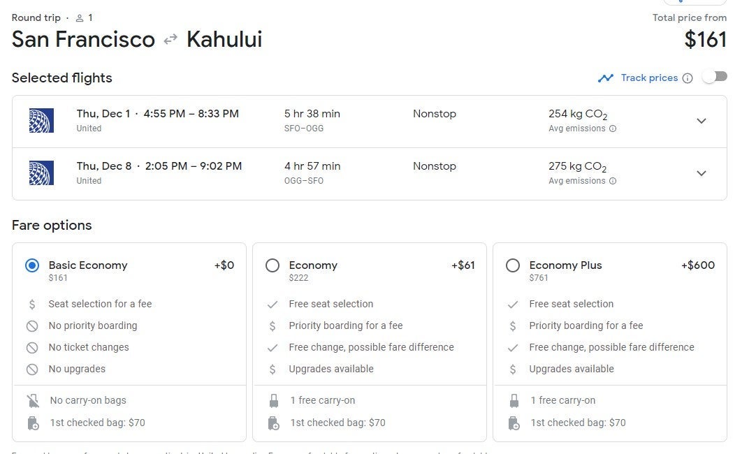 A sample United flight in December from San Francisco shows the additional costs for flying this route on regular Economy (+$61) and Economy Plus (+$600).