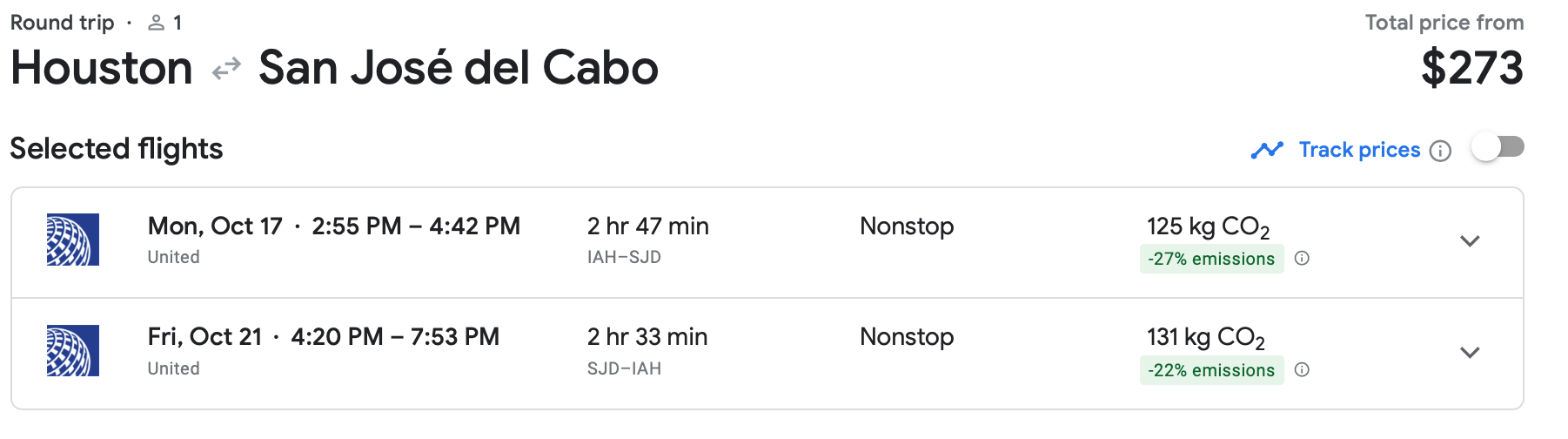 Houston to Mexico is also available in this deal. United has nonstop flights from George Bush Intercontinental Airport (IAH) to San Jose del Cabo for $273 round trip.