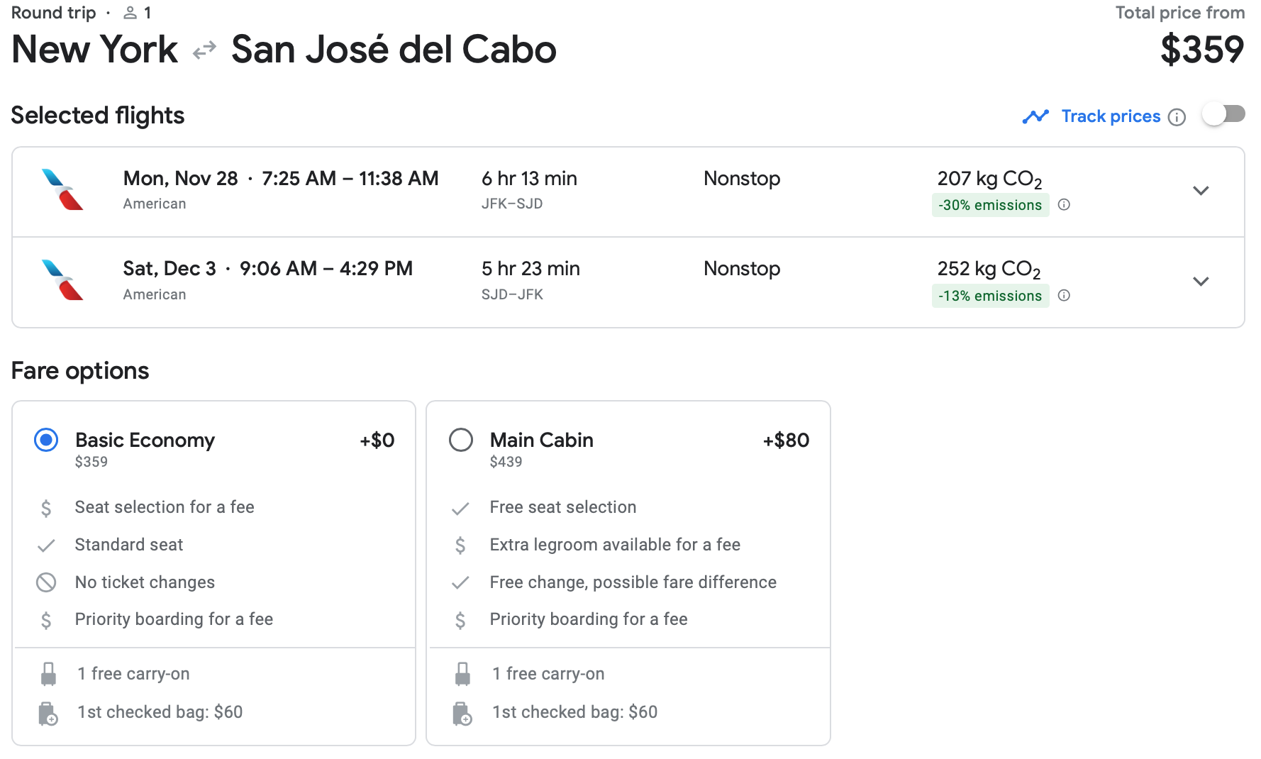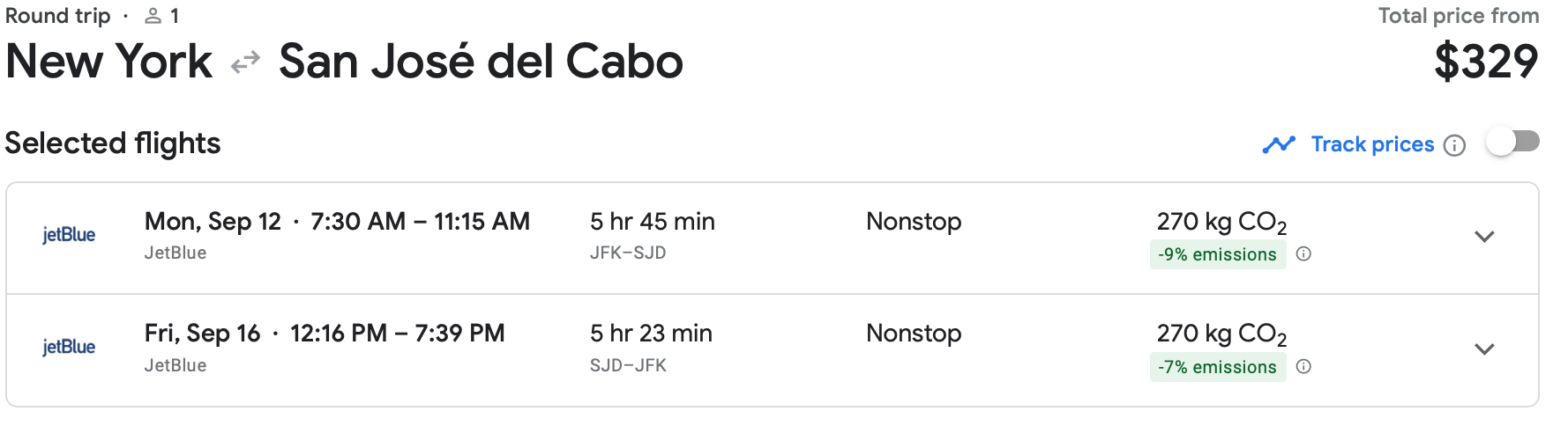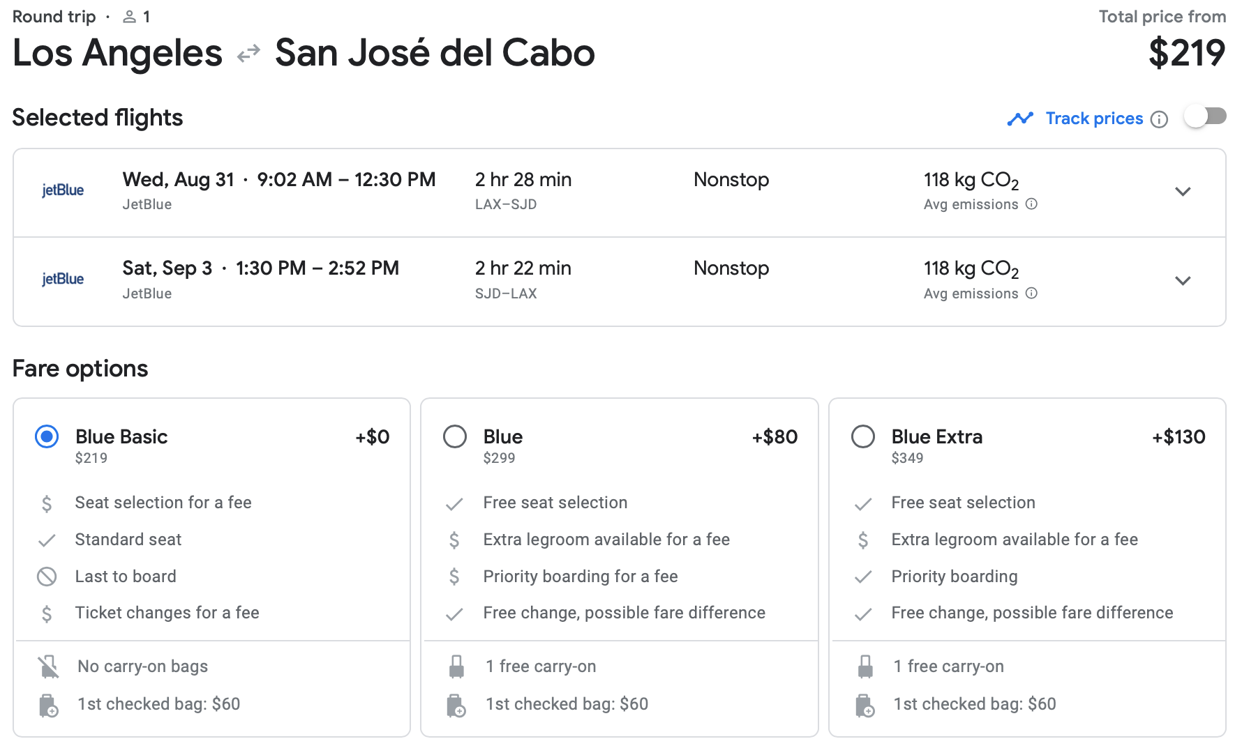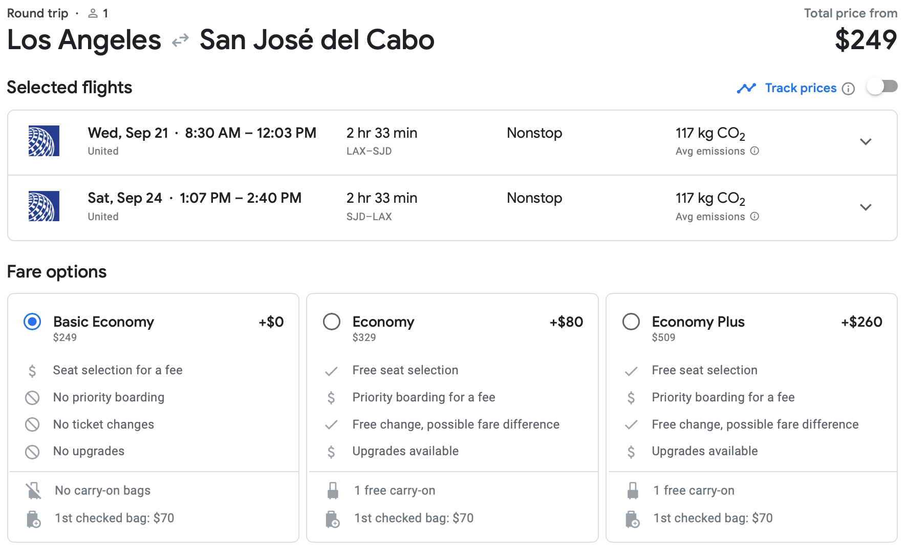 United has basic economy nonstop flights in late September from LAX to Los Cabos for $249 round trip. Same deal as with JetBlue; you'll have to pay $35 each way to check a bag.