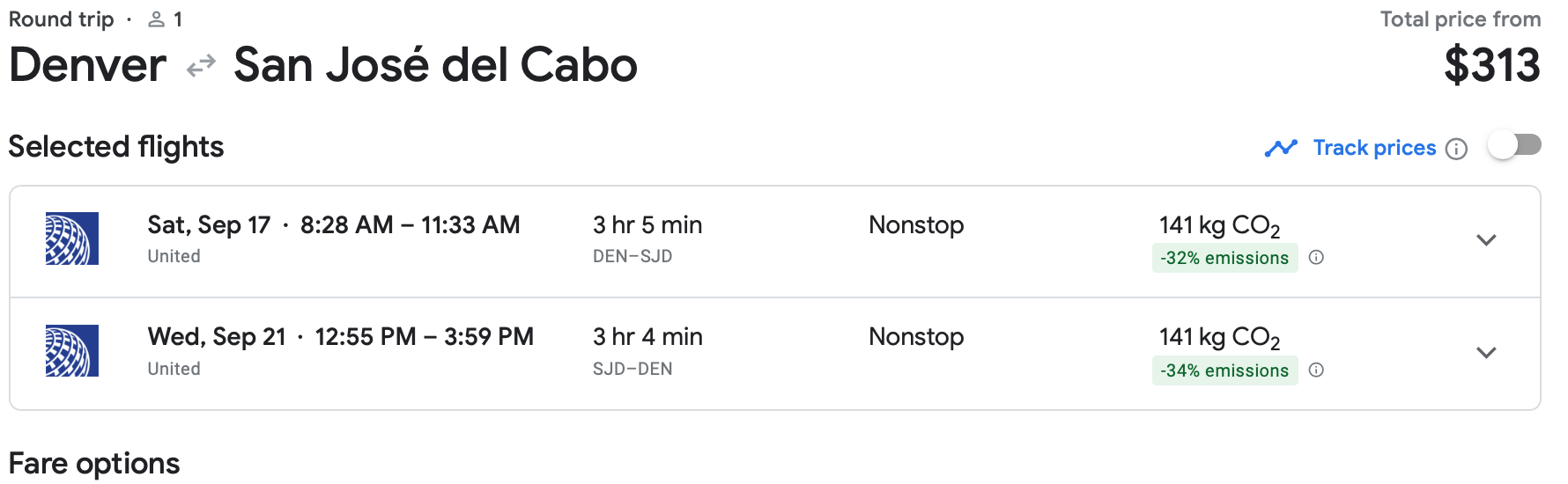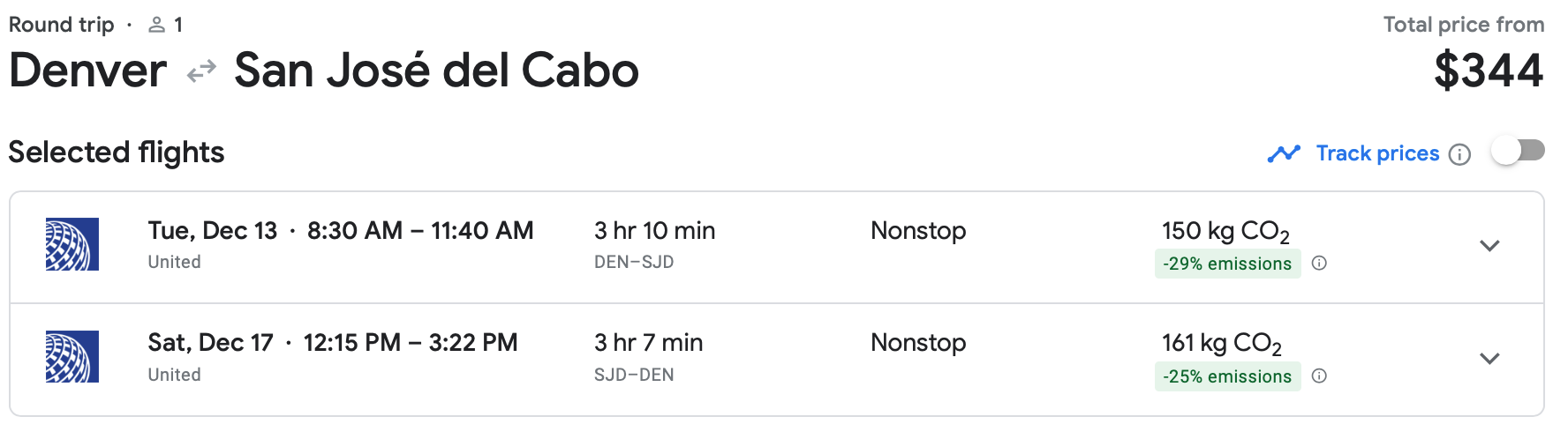 We'll end with some great prices on flights out of Denver. United has nonstop flights from Denver International Airport (DEN) to Los Cabos for as low as $313 round trip in September. We found several juicy price cuts for flights from Denver to Mexico in December, too.
