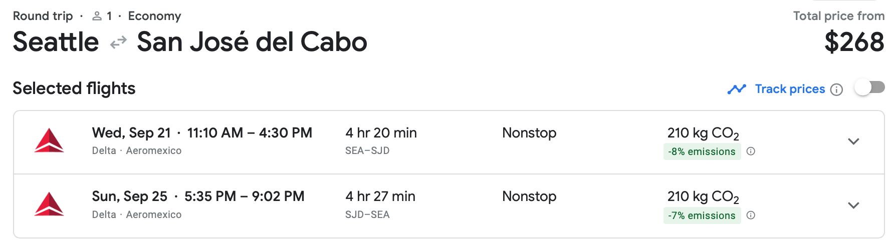 September is also when you can book a Delta economy ticket from Seattle-Tacoma International Airport (SEA) to Los Cabos for $268 nonstop.