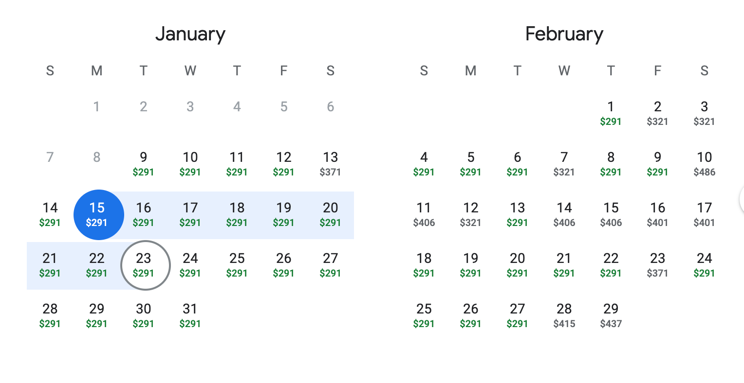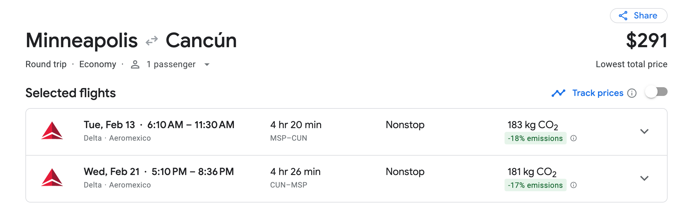 There are plenty of flight options from Minneapolis-St. Paul International Airport (MSP) to Cancun International Airport (CUN) throughout January and February, as you can see in the Google Flights calendar below.
