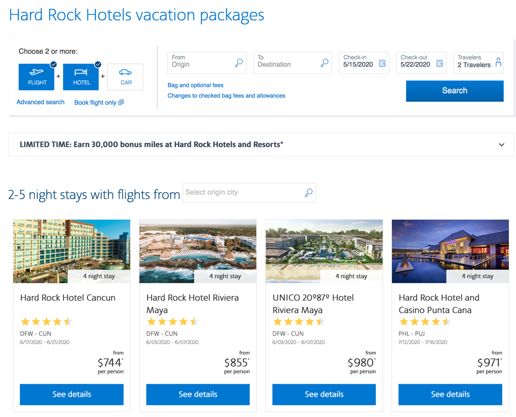 American Vacations is currently offering 30,000 bonus American miles when you book a flight and hotel package at select Hard Rock Hotel locations in Mexico and the Dominican Republic. You can earn bonus miles on stays of two or more nights at these Hard Rock Hotel locations: