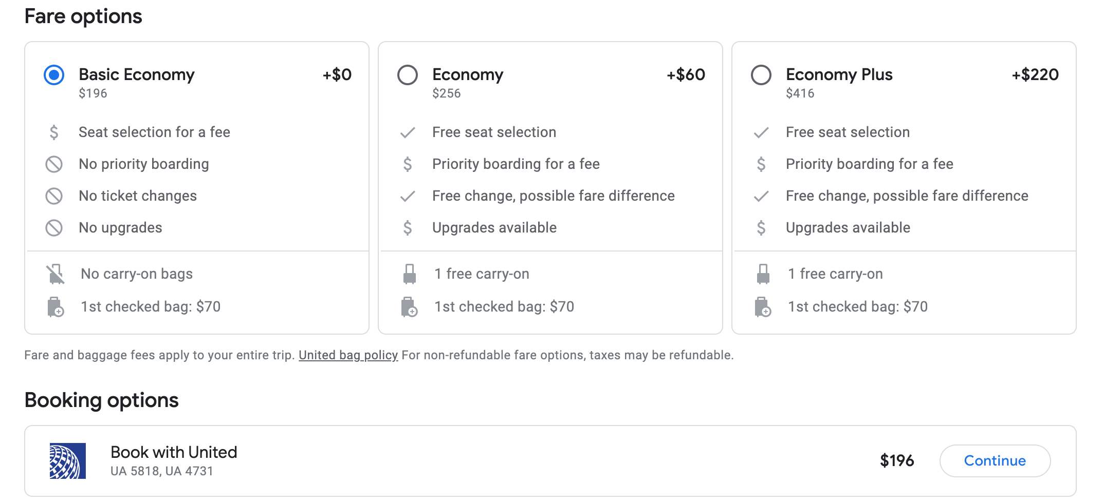 You'd pay $196 for basic economy, which only includes a personal item. You can pay $70 to check a bag or $60 to upgrade to economy with an included carry-on.
