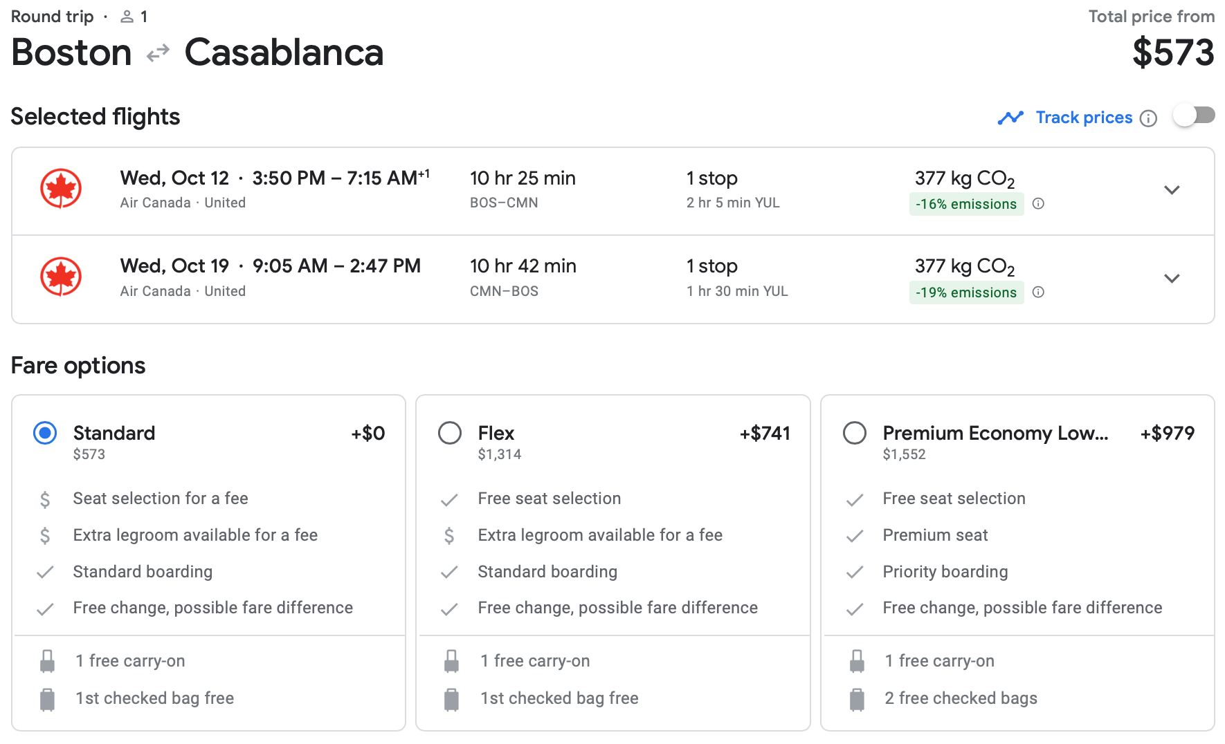 Boston to Casablanca is also available for less than $600 round trip in October. You fly from Boston Logan International Airport (BOS) to Morocco with a layover in Montreal each way. There was some availability for this route in November as well.
