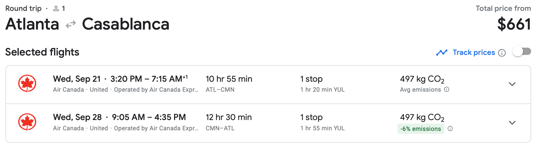 Air Canada has flights from Atlanta to Morocco for $661 round trip. You travel from Hartsfield-Jackson Atlanta International Airport (ATL) to Casablanca with a stop in Montreal each way. You get a free carry-on and a checked bag.