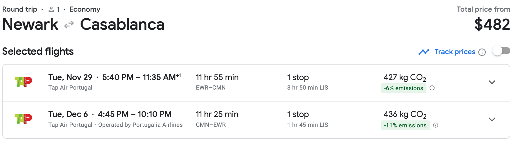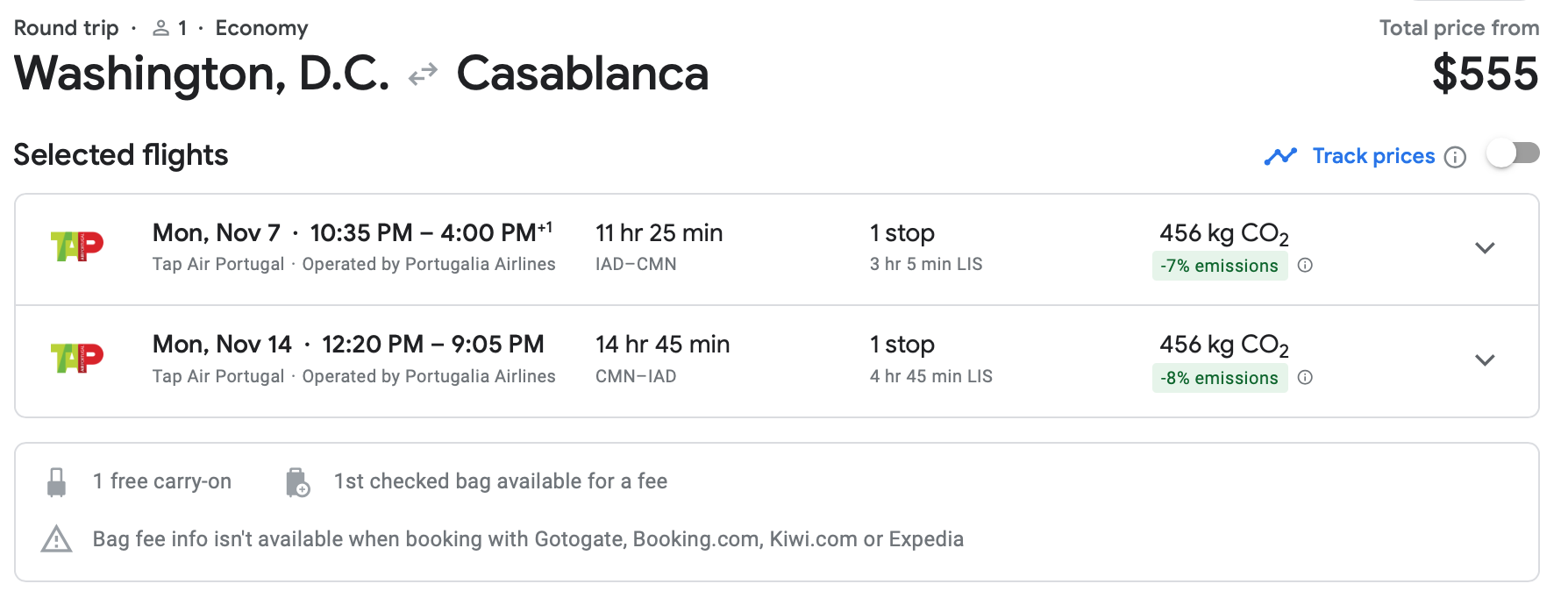 Here is a nice price out of Washington, D.C. TAP has $555 round-trip fares from Dulles International Airport (IAD) to Casablanca, also in November.